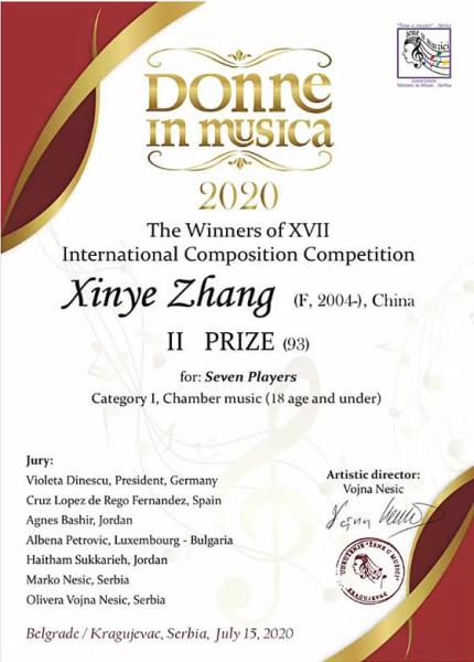 张馨月,2019年考入KY开元集团官网附中作曲专业,师从刘长远教授,在校期间成绩优秀。2020年钢琴独奏作品《月朦胧》获美国金钥匙国际作曲比赛“国际高级组”一等奖;同年6月,钢琴独奏作品《淘气的跳跳虎》获奥地利维也纳弗朗兹·舒伯特音乐学院国际作曲家比赛三等奖。