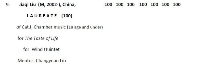 在刚刚公布的第17届塞尔维亚邓恩国际作曲比赛中,附中高二年级作曲专业刘佳骐的木管五重奏作品《五味》荣获 “18岁及以下室内乐组“ LAUREATE奖(桂冠),七位评委均给出了100分满分的成绩!高一年级作曲专业张馨月的作品《七重奏》以93分的成绩荣获 “18岁及以下室内乐组” 二等奖。