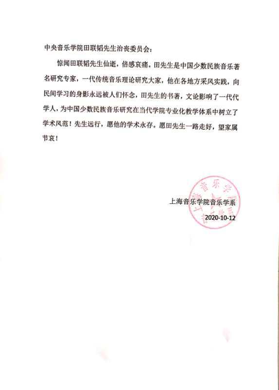 中央民族大学音乐学院发来唁电