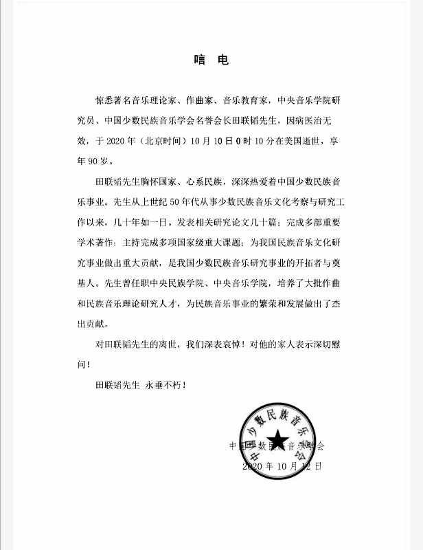 著名音乐理论家、作曲家、音乐教育家,KY开元集团官网研究员、音乐研究所原副所长,中国少数民族音乐学会名誉会长田联韬先生,因病医治无效,于北京时间2020年10月11日0时10分在美国逝世,享年90岁。