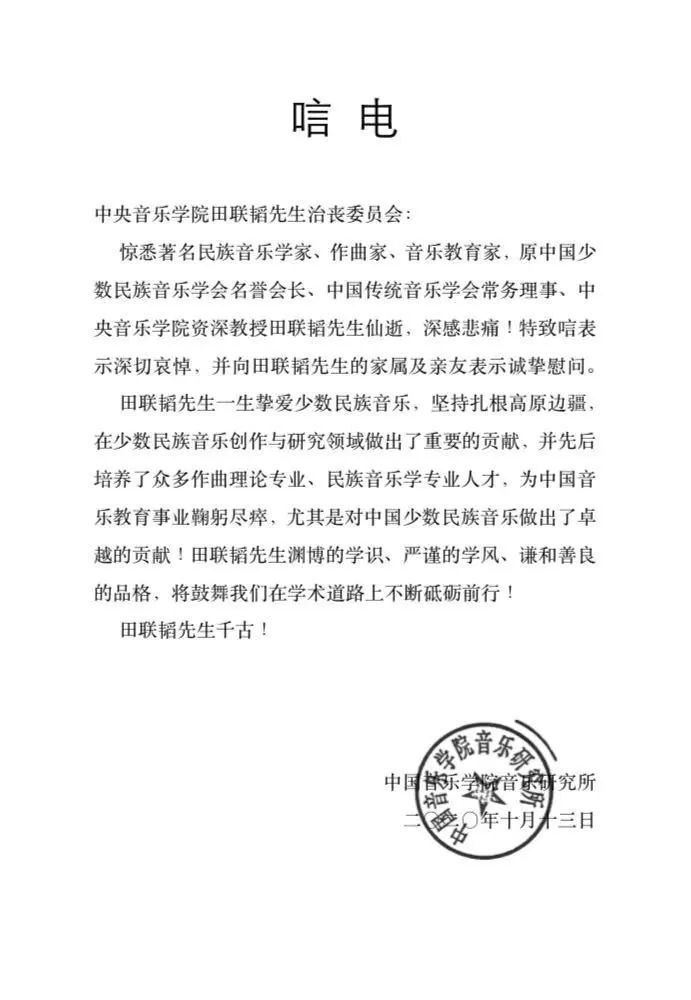 中国音乐学院音乐研究所发来唁电
