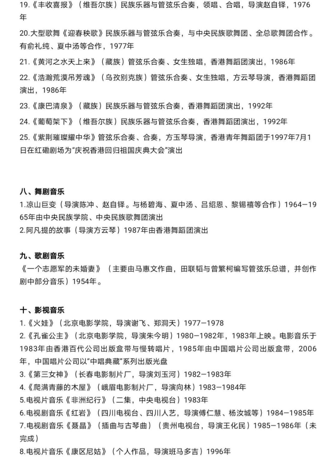 田联韬教授不仅是深受学界推崇、爱戴的资深民族音乐教育家和理论家,他还是出过众多优质、高产音乐作品的杰出的作曲家。从上世纪中叶以来,他创作了一批少数民族音乐题材的优秀作品,如电影音乐《孔雀公主》、《火娃》、《第三女神》、《爬满青藤的木屋》等;电视音乐:《红岩》、《非洲纪行》等;舞剧音乐《凉山巨变》(合作)、《阿凡提的故事》等;舞蹈音乐《黄河之水天上来》、《茶花朵朵》、《织氆氇》、《送粮路上》(合作)等数十首;钢琴曲《塔吉克舞曲》、《天山的节日》,小提琴曲《帕米尔随想》,大提琴曲《红河的孩子》、《喜玛拉雅随想曲》(合作)等。1983、2005年先后在香港、北京出版发行电影音乐《孔雀公主》磁带、密纹唱片、CD光盘。在这些作品中,田师总是能够恰当地把握好音乐体裁和民族风格的关系和火候,充分发挥自己长期学习、钻研少数民族音乐的优势,让自己的创作既能够让音乐界同行满意认可,也要让本民族群众和广大听者、观众由衷地喜爱和接受。