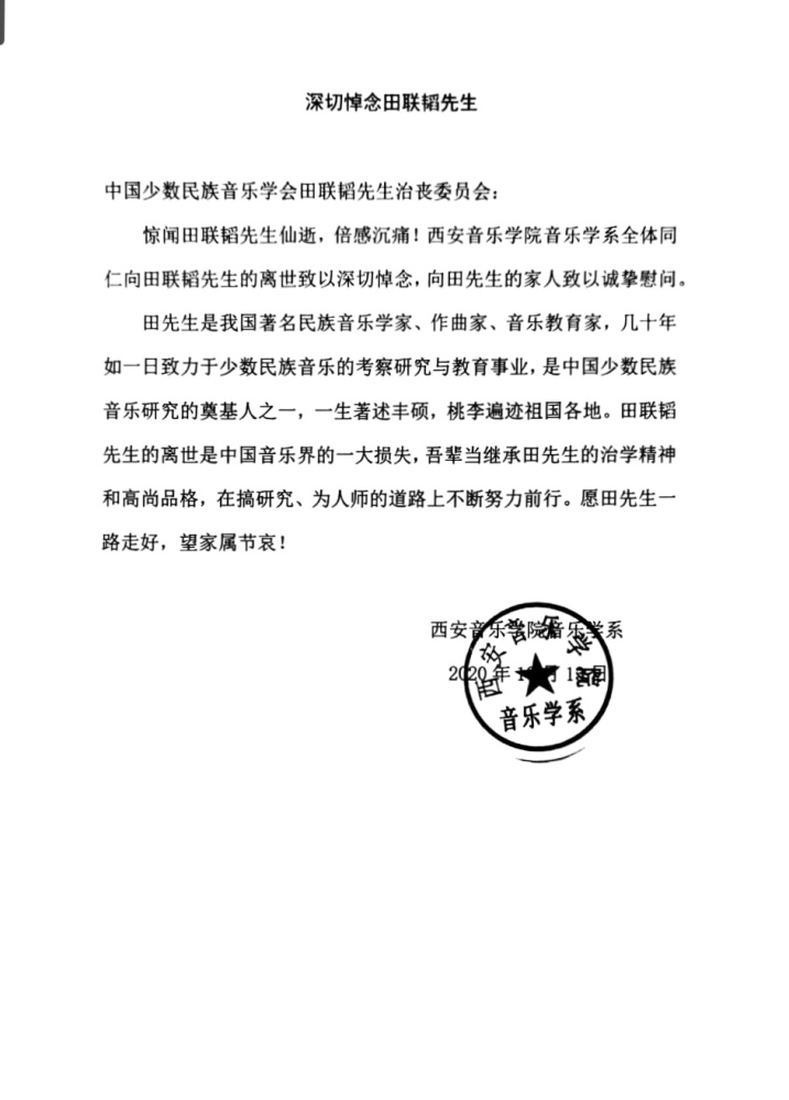 西安音乐学院音乐学系发来唁电