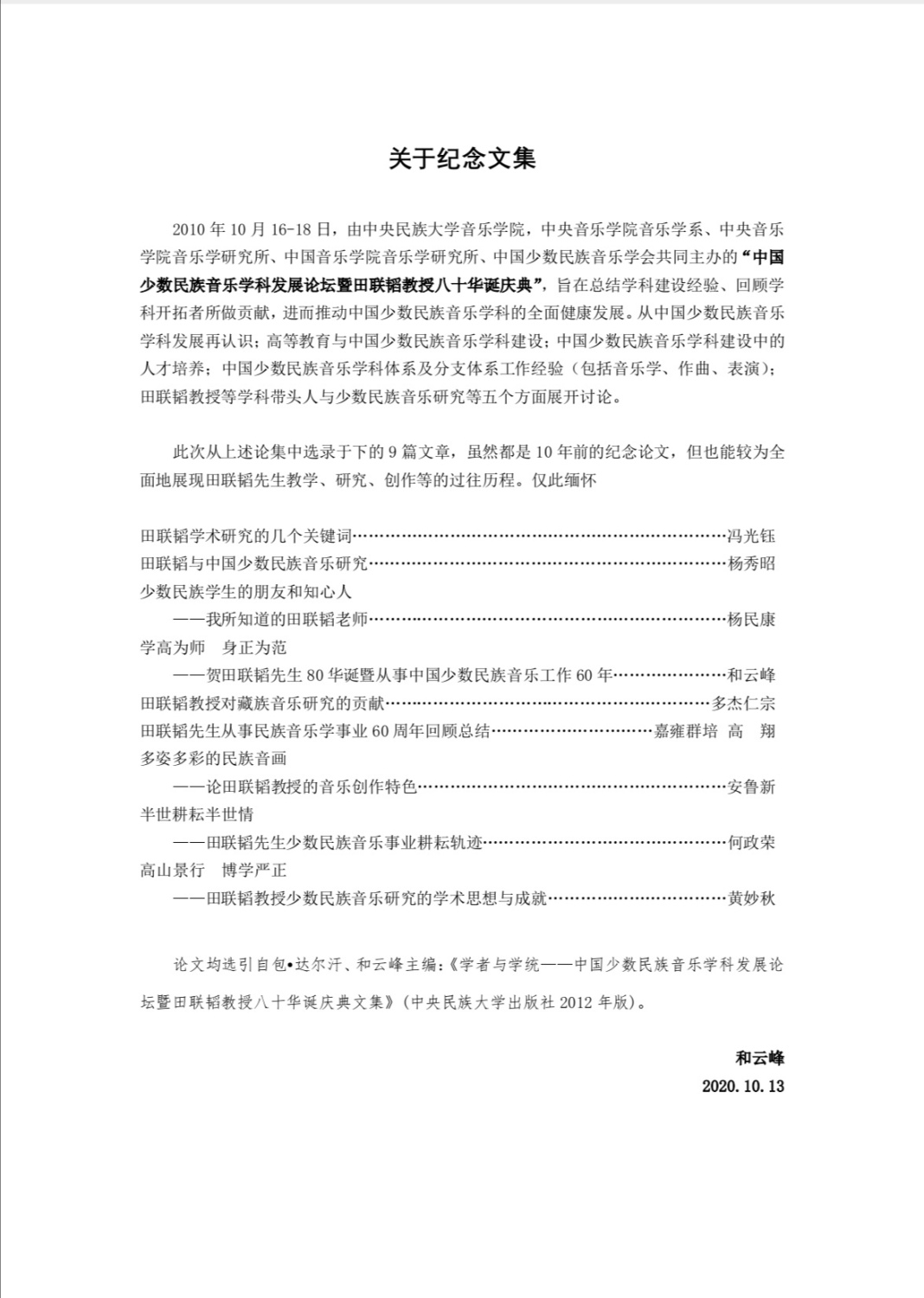 长期从事少数民族传统音乐教学、研究和创作工作,田先生深感资料的收集与积累是创作与研究的重要基础。60年来他一直密切注意全国各地(特别是少数民族地区)的出版信息,尽力收集和保存有关少数民族音乐的各类出版书籍。收存中他发现,国内编印的此类书内部资料颇多,水平参差不齐且不少存在正式发行的困难。鉴于此,他将此类书物,尤其是未发行的油印资料本,通过仔细筛选后列入他辑编的《中国少数民族传统音乐研究参考书目汇编》中,并基于前面所述之因在汇整参考书目时,提出自己的观点,即未严格遵循传统音乐的分类级别划书目分类,而是参照各类书目的数量与内容,将全部书目划为八个类别:1.综合类,2.民间歌曲类,3民间歌舞音乐类,4.民族戏剧音乐(戏曲音乐)类。5.民族乐器及器乐音乐类,6说唱音乐(曲艺行乐)类,7宫廷音乐类、8.宗教音乐类。最后诚挚地期待各地读者,特别是少数民族地区的读者和同仁,为该书目汇编提供应增补的书目,以使之更加完备。