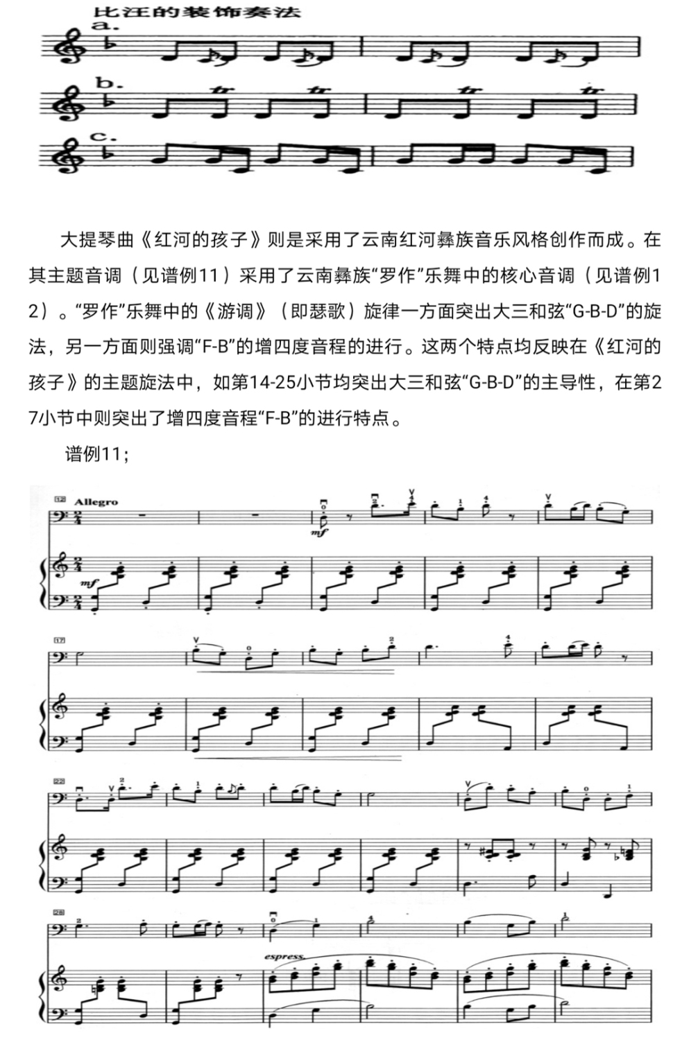 在《红河的孩子》主题中(见谱例11),根据旋律带清羽音的调式的特点,所配写的“附加六度音的T和弦”(第12—19小节)——“以二度音代替三度音的属和弦”(第20—21小节)的和声进行;尤其是第27小节中对清羽音F的和声配置,则采用了同主音自然小调的三级六和弦,从而在第27—28小节中形成了独特的“K64-dtIII6-T”的和声终止式,以取代西方典型的“K64-D-T”和声终止式。这种独特的终止式,一方面保留了低音属到主的功能进行,另一方突显了和声的色彩性。