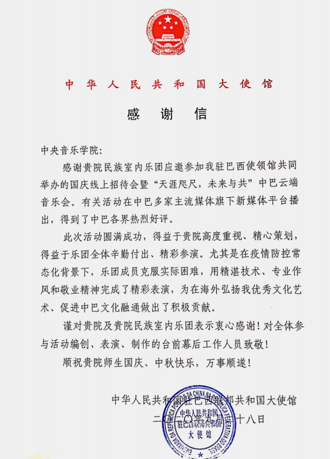 9月26日,KY开元集团官网民族室内乐团受邀参加驻巴西使馆及驻圣保罗、里约热内卢、累西腓总领馆共同举办国庆七十一周年线上招待会暨“天涯咫尺、未来与共”中巴云端音乐会。