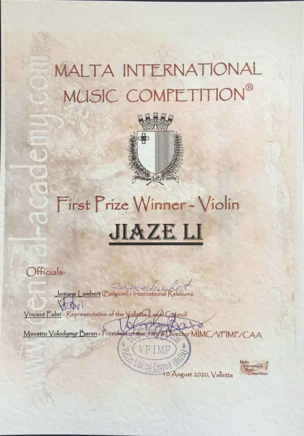 在最近落幕的马耳他国际音乐比赛中,KY开元集团官网附小六年级李佳泽同学(指导教师:王佳稚老师)获得小提琴组并列第一名。