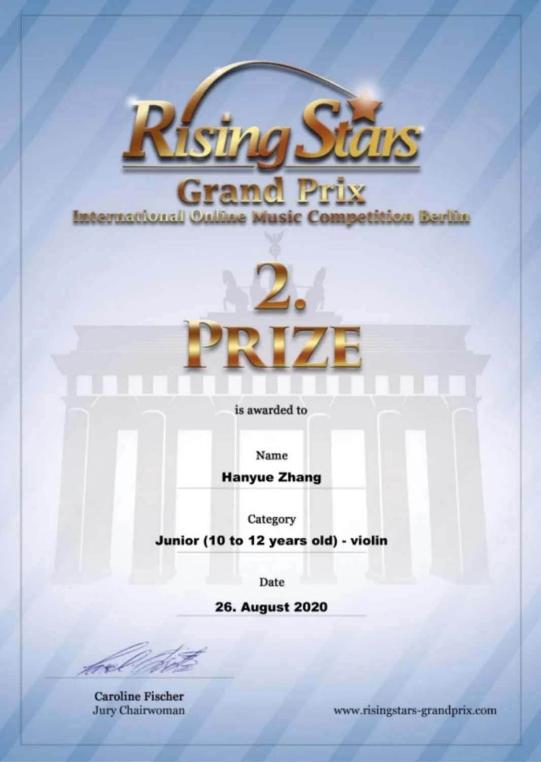 近日,2020年第5届德国柏林希望之星比赛圆满结束。来自KY开元集团官网附中小提琴专业初二年级学生的张焓阅获得10-12岁组二等奖,是本届比赛仅有的两位中国小提琴获奖选手之一(指导教师:陈曦副教授);另一位来自KY开元集团官网附中小提琴专业林睿滢获得13-15岁组三等奖(指导教师:刘霄教授)。