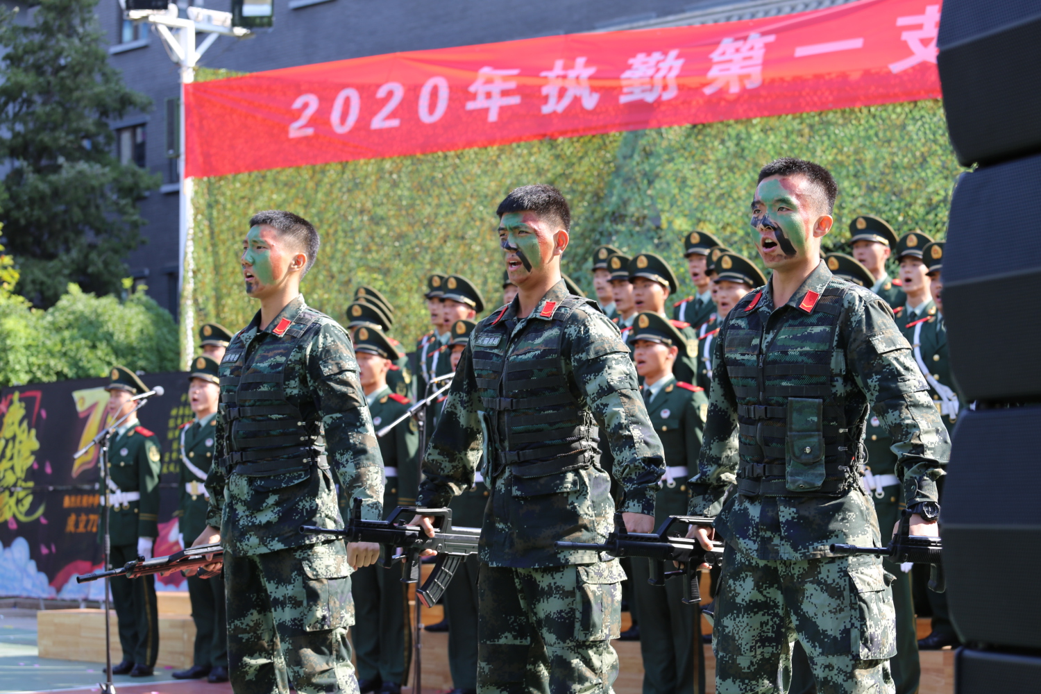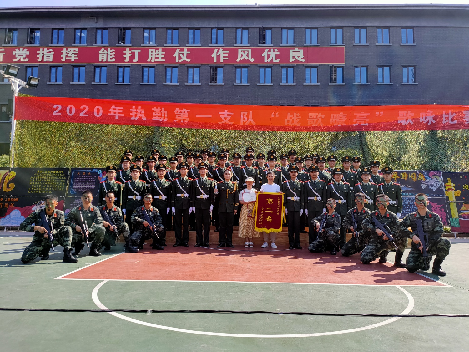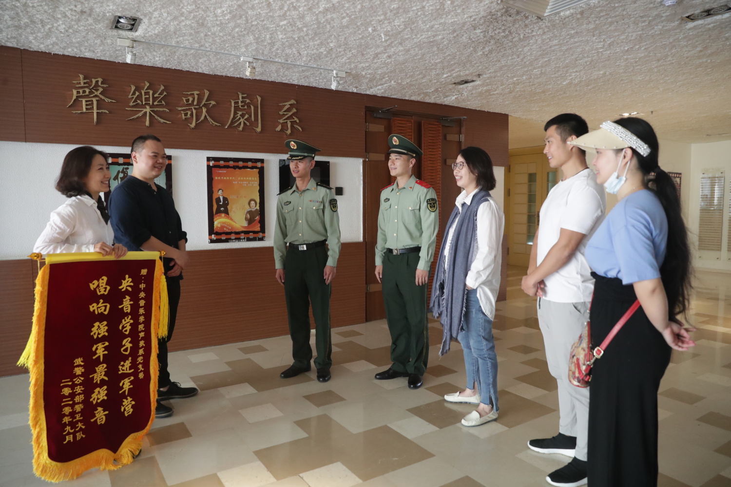 2020年9月25日上午,武警天安门支队国博中队的领导和战士来到KY开元,代表天安门支队为声歌系党总支送来了一面锦旗,对于声歌系学生为战士们辅导排练合唱取得的丰硕成果表示感谢,并希望声歌系与支队的共建工作继续更好的开展。