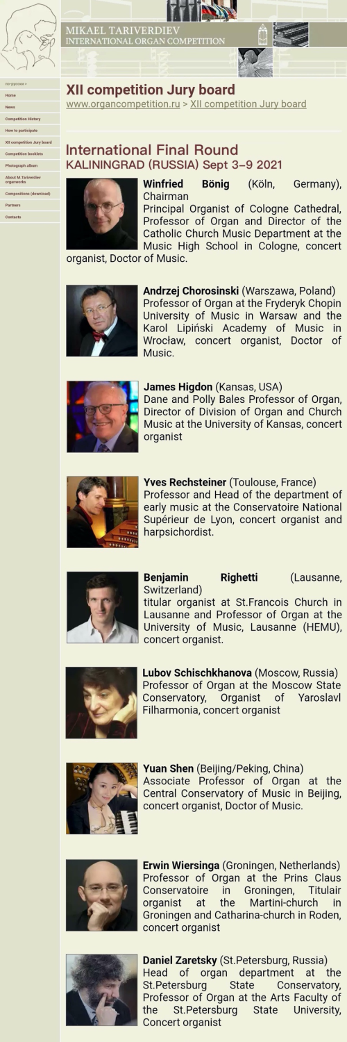 我作为圣彼得堡音乐学院管风琴系主任、俄罗斯国际迈克尔·塔里维尔季耶夫国际管风琴比赛组委会主席,我十分荣幸地邀请您担任2021年第十二届迈克尔·塔里维尔季耶夫国际管风琴比赛的评委,该比赛将于2021年9月3日至9日在俄罗斯最大的管风琴上举行。我们的比赛有着悠久的历史,对于管风琴界来说,它与国际钢琴,小提琴、大提琴以及声乐的著名比赛的“柴可夫斯基音乐比赛”同样重要!