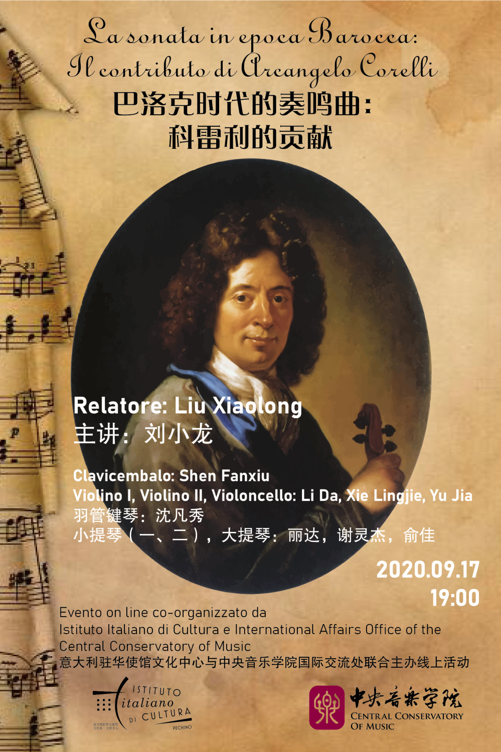 “话中有乐:音乐解读与欣赏”系列首场讲座将于2020年9月17日(周四)19:00在意大利驻华使馆文化中心举行,由KY开元音乐学系刘小龙副教授主讲。他将以《巴洛克时代的奏鸣曲:科雷利的贡献》为题,讨论三重奏鸣曲的具体分类、器乐构成、表演方式和文化语境,并由沈凡秀教授、俞佳副教授和丽达老师等现场示范演奏阿尔康格罗·科雷利(Arcangelo Corelli, 1653—1713年)最具代表性的三部《三重奏鸣曲》,(trio sonata),以最真切的形式让热心观众了解巴罗克奏鸣曲的面貌与尝试,感受意大利器乐音乐的文化特色与魅力。