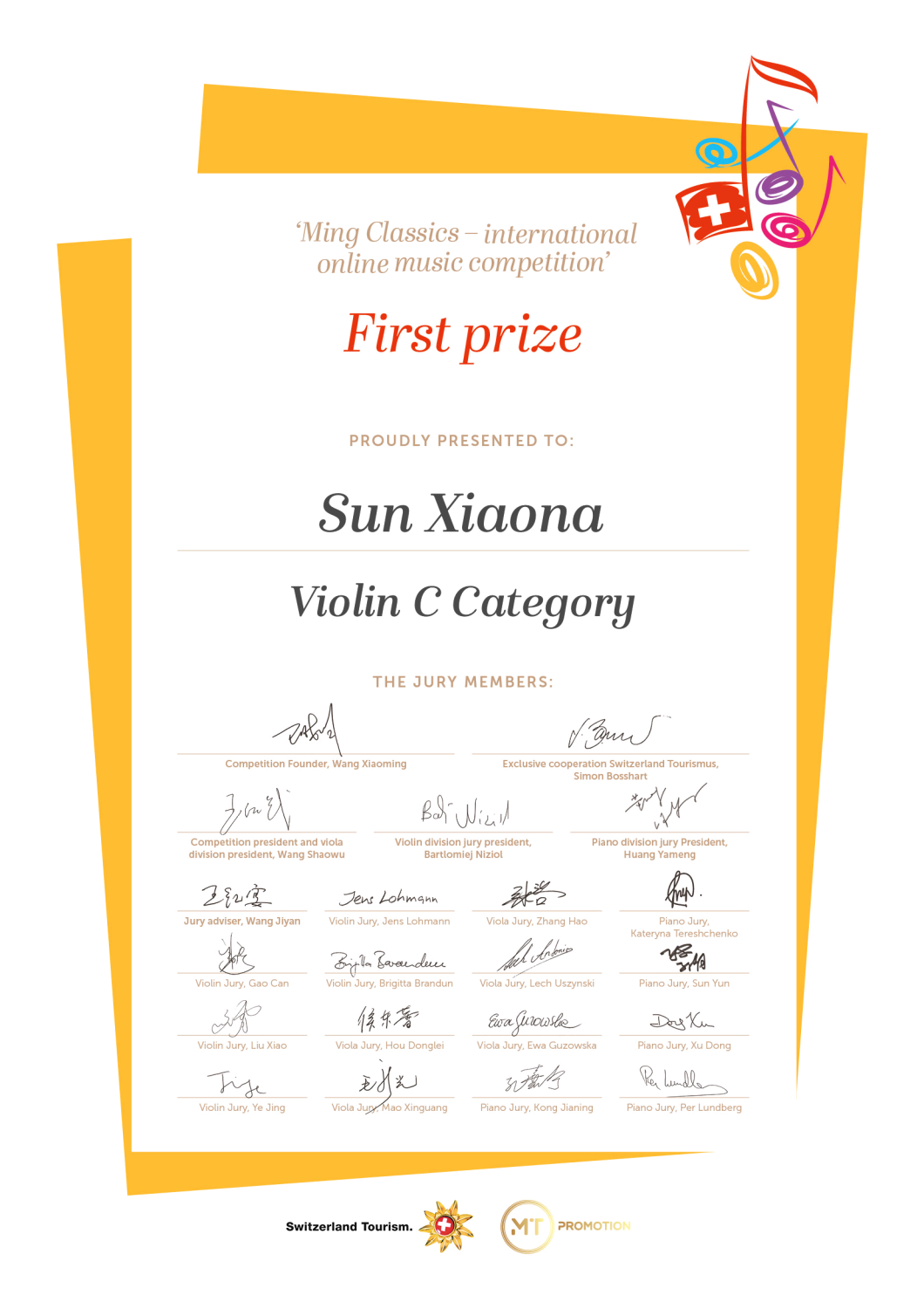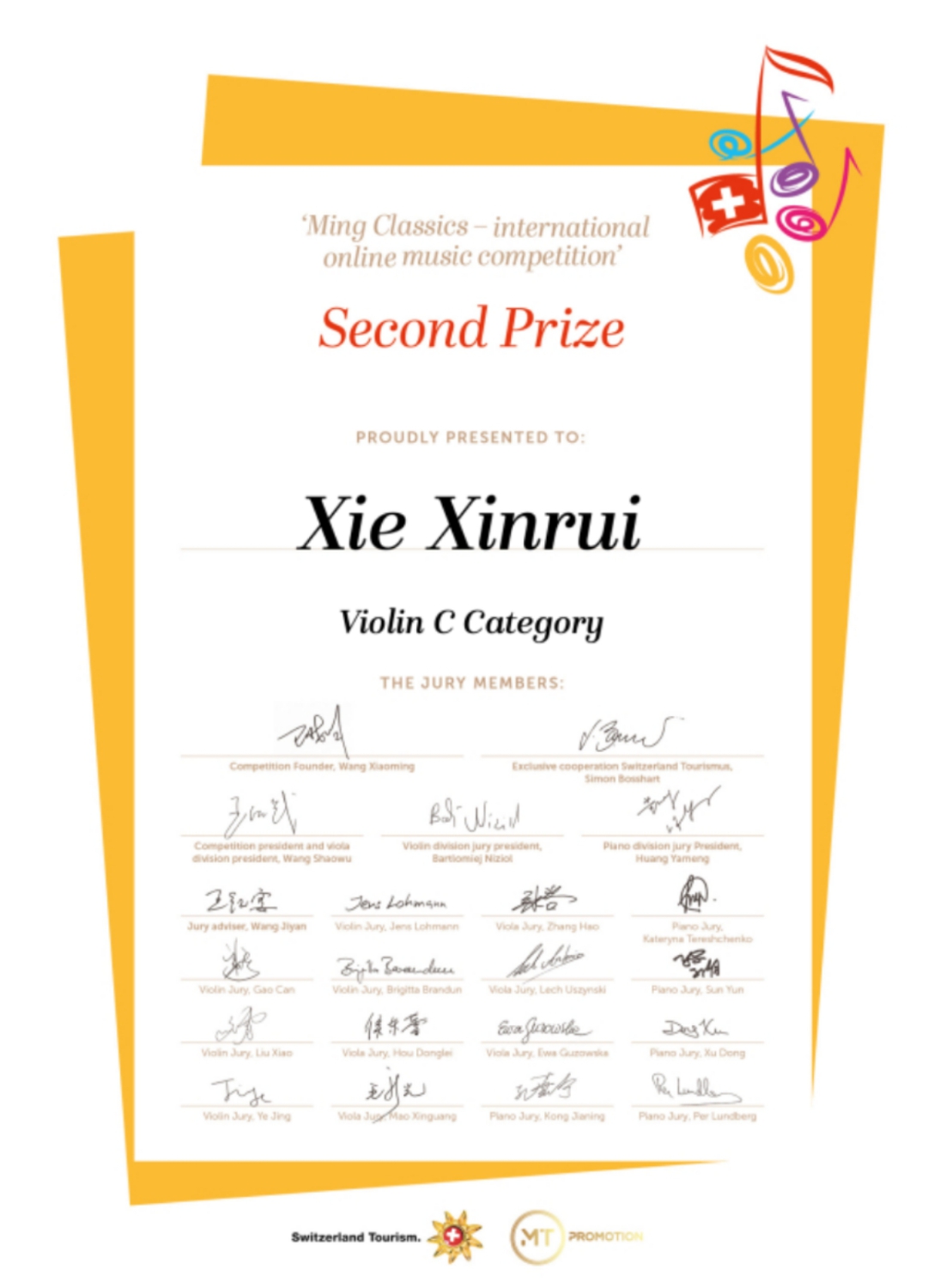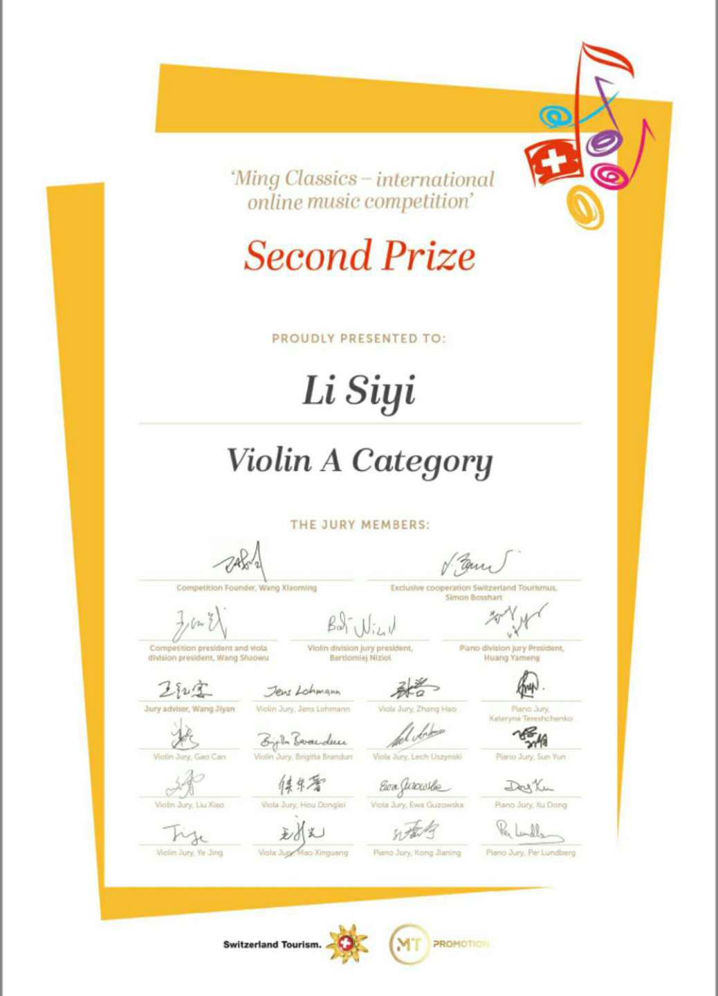 2019年瑞士斯特拉迪瓦里音乐节比赛少年组 一等奖;