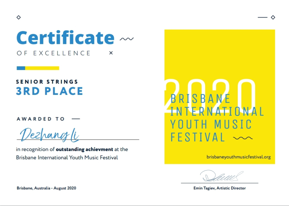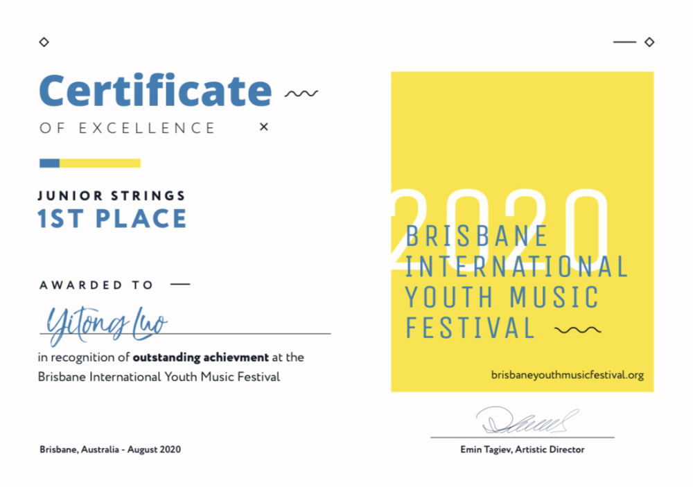 澳大利亚布里斯班国际青少年古典音乐节为非营利性组织,创办于2012年。组委会通过国际性的教育活动、比赛、音乐会等活动选拔25岁以下的优秀音乐家。本届大赛有来自澳大利亚、中国大陆、香港、韩国、美国、马来西亚等多国选手,经过激烈角逐共15位参赛者进入了决赛。因全球新冠疫情的特殊原因,本届比赛取消了以往现场比赛的方式,改为线上提交演奏视频的方式进行。