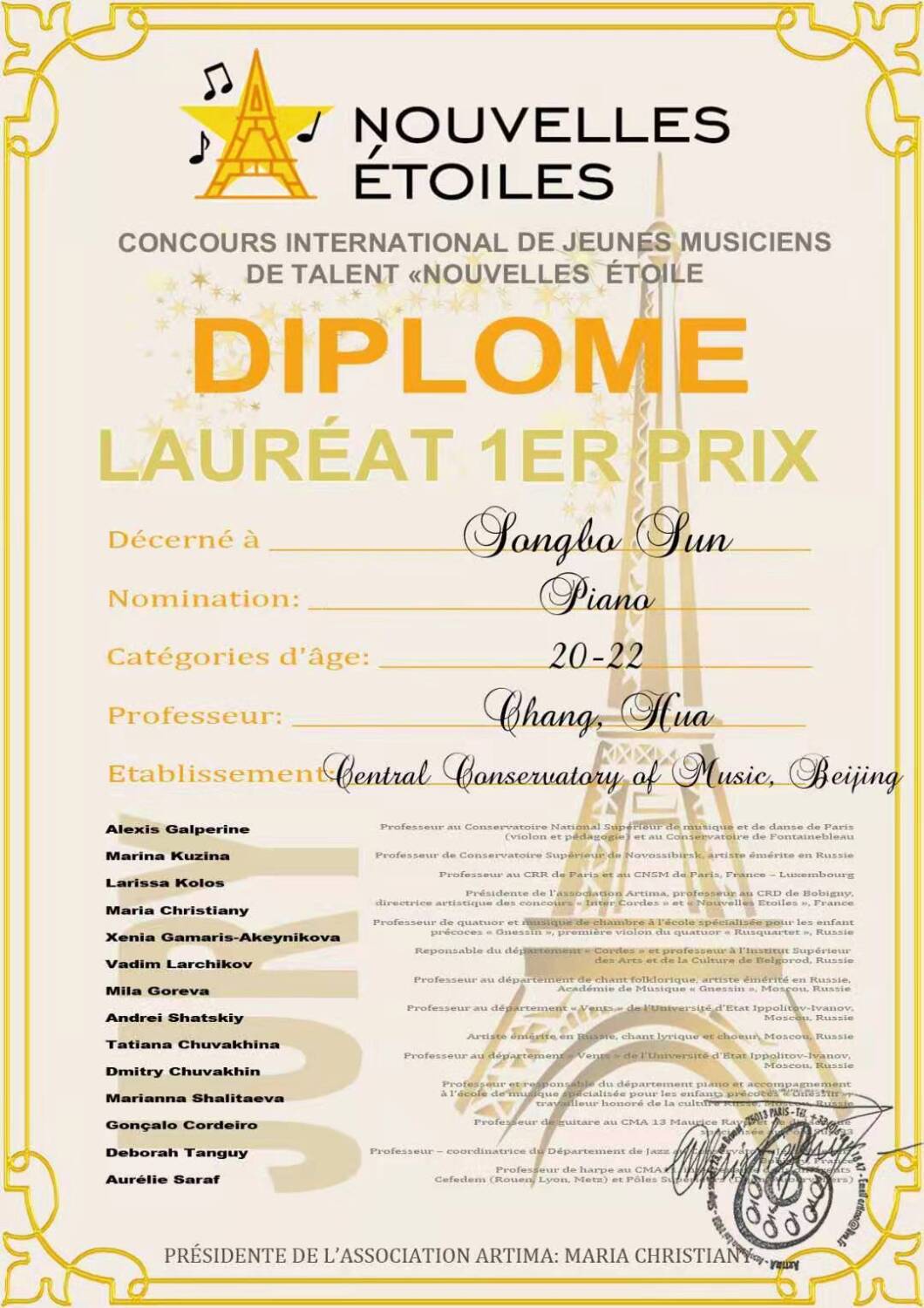 本届大赛由法国巴黎埃蒂玛国际文化协会主办,明弓专业室内乐团、让•威纳音乐学院协办,获得世界各大知名学府的广泛关注,吸引了来自美国、德国、法国、荷兰、西班牙等各国的数十名优秀青年钢琴家参赛。最终来自KY开元集团官网的孙崧博摘得桂冠,同时也是自比赛举行以来,首位获得奖项的中国人。