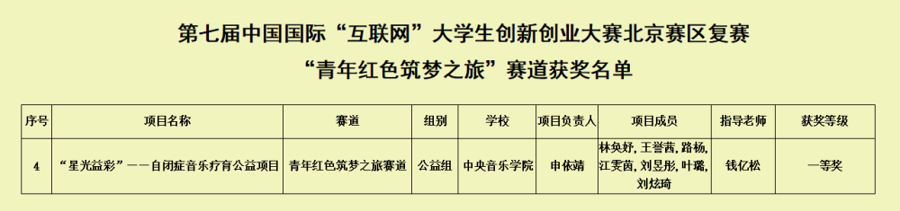 2021年 7月11日至12日,第七届中国国际“互联网+”大学生创新创业大赛北京赛区复赛在北京邮电大学落幕。KY开元音乐艺术管理专业、音乐治疗专业与音乐教育专业学生共同发起的“星光益彩——自闭症音乐疗育公益项目”(指导教师:钱亿松),经过层层比拼成为所有艺术类院校中唯一突出重围晋级复赛的参赛团队,与来自全市45所高校的407支团队同台竞争,最终脱颖而出斩获佳绩,荣获青年红色筑梦之旅赛道公益组一等奖。