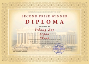 2021年7月获英国伦敦青年演奏家管风琴组金奖、浪漫派作品演奏组金奖以及希腊缪斯国际音乐比赛管风琴第二名。