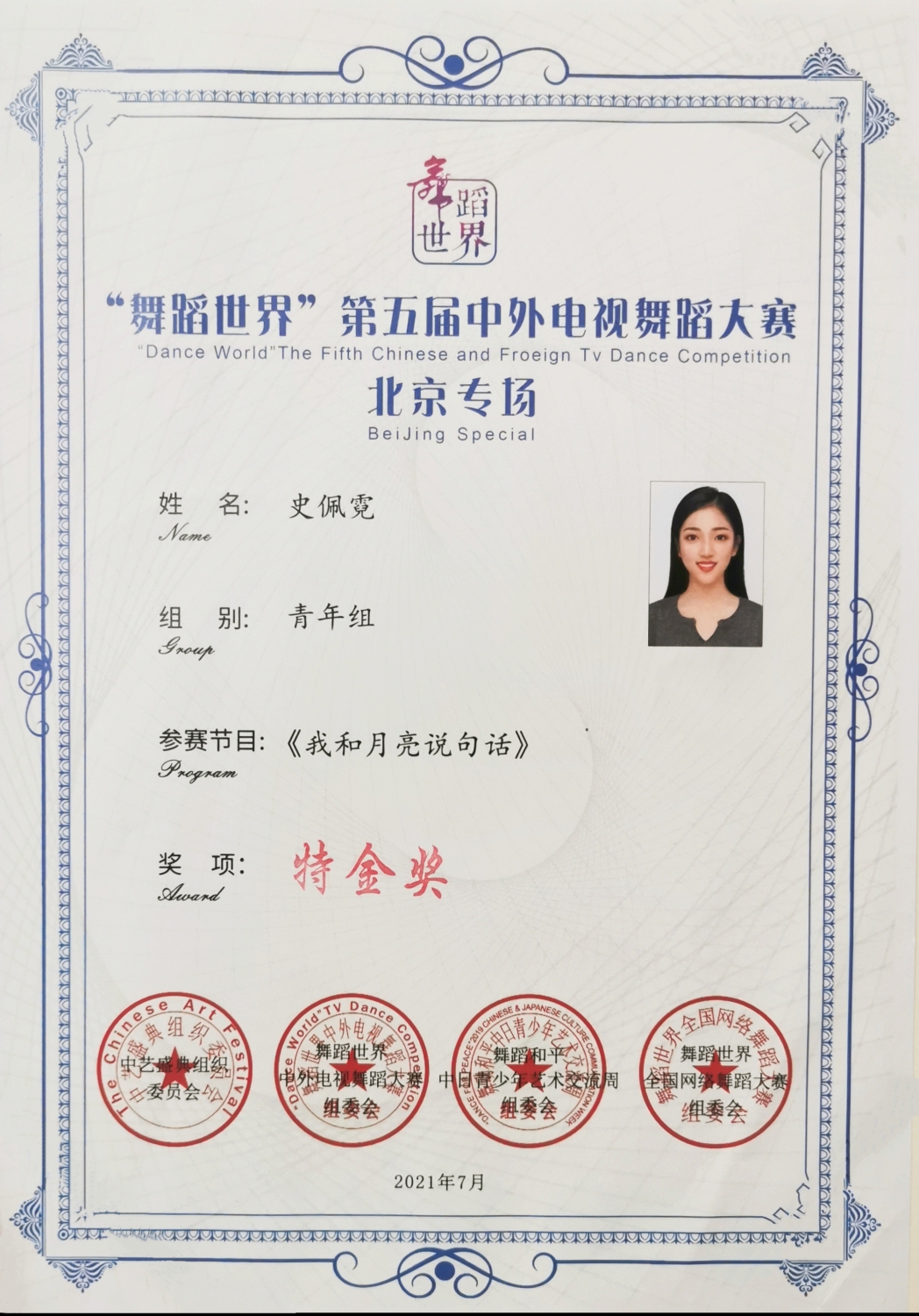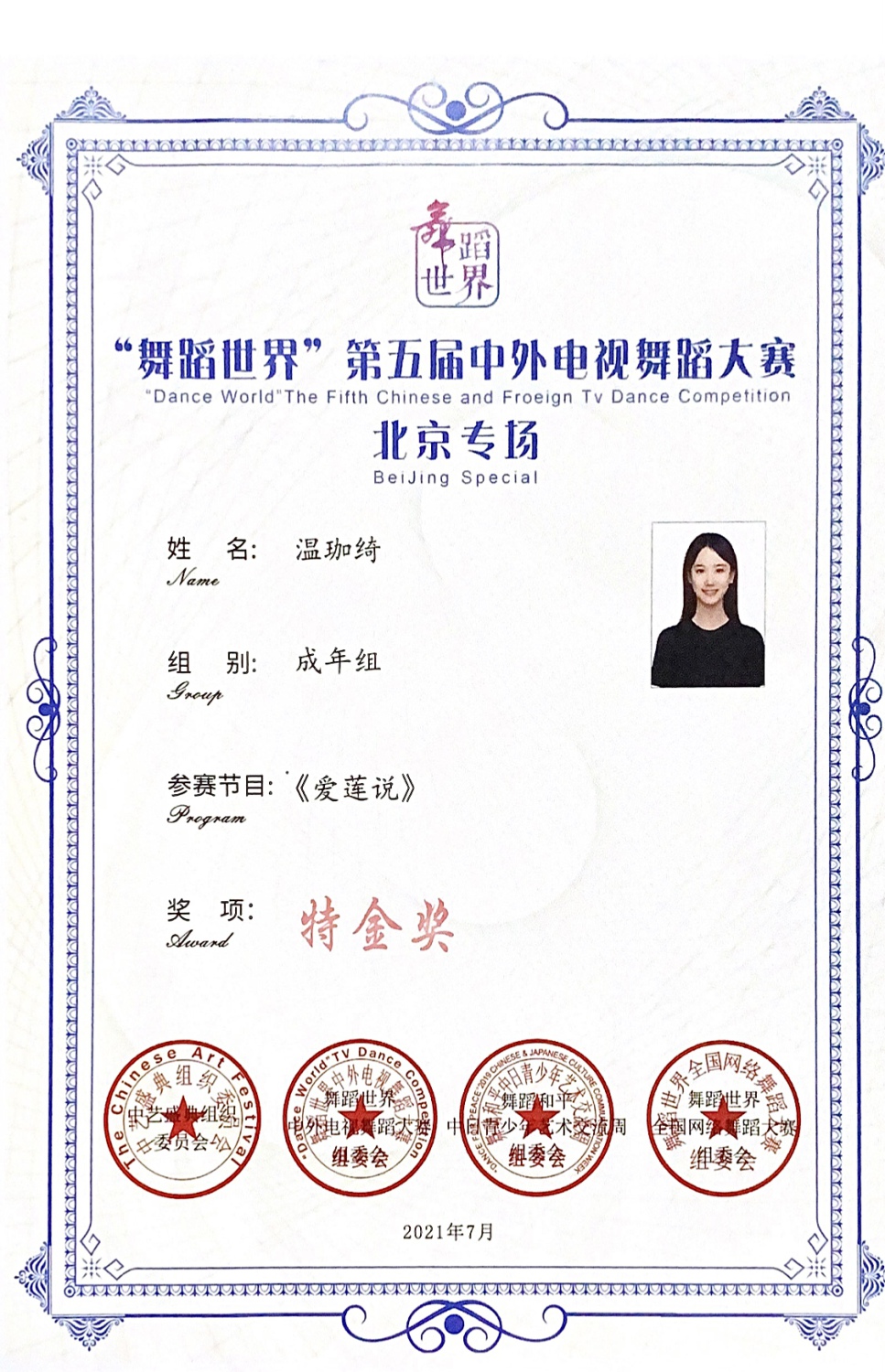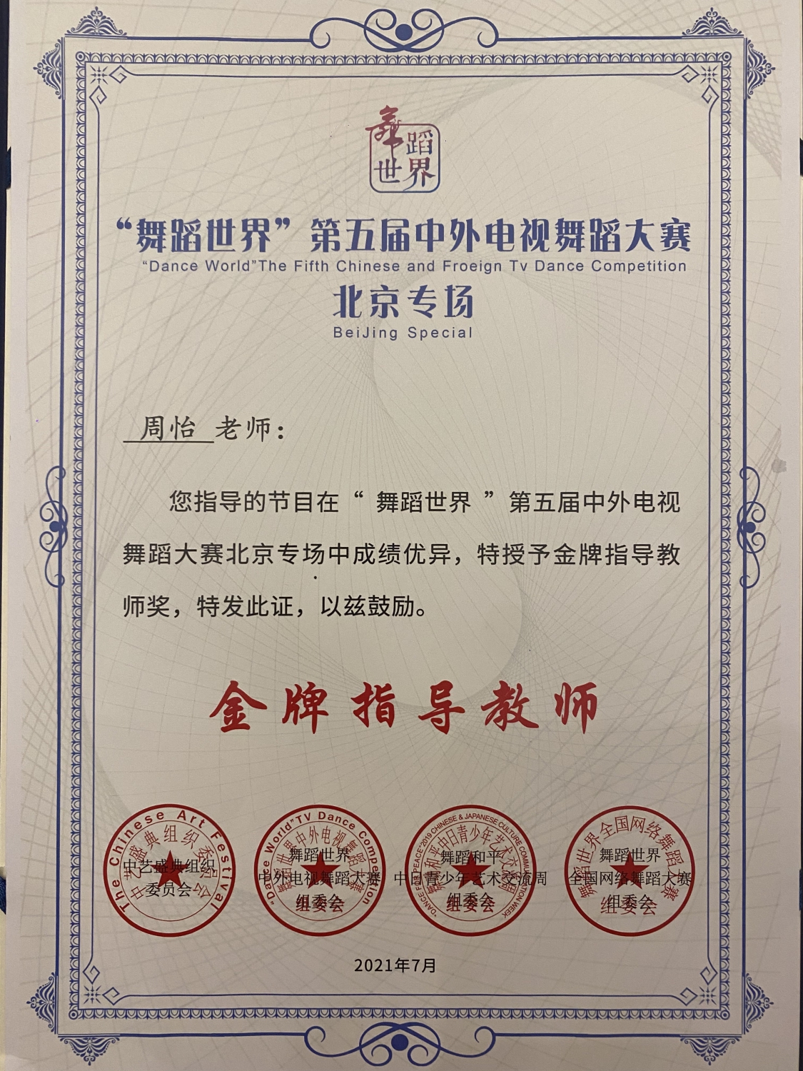 2021年7月4日,CCTV舞蹈世界第五届中外电视舞蹈大赛北京专场大幕拉开,竞演当天共103个节目参演,经过激烈的角逐,经由评委老师现场打分评选出铜奖、银奖、金奖以及特金奖作品,由KY开元人文学部青年舞蹈教师周怡指导的音乐教育学院温珈绮同学的《爱莲说》和史佩霓同学的《我和月亮说句话》凭借出色的表演征服了现场评委,最终包揽青年组的两项特金奖。周怡获金牌教师指导奖。