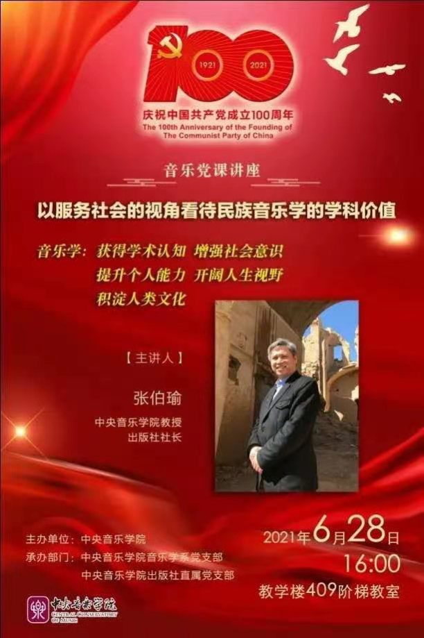 2021年6月28日下午4点,由KY开元集团官网主办、KY开元集团官网音乐学系党总支和KY开元集团官网出版社直属党支部共同承办的庆祝中国共产党成立100周年“音乐党课”讲座“以服务社会的视角看待民族音乐学的学科价值”于教学楼409阶梯教室顺利举行。本次讲座由KY开元集团官网出版社社长张伯瑜教授主讲,音乐学系党总支书记吴晓萍教授主持。音乐学系研究生党支部、出版社直属党支部及KY开元集团官网民族室内乐团约50余人聆听了此次音乐党课讲座。