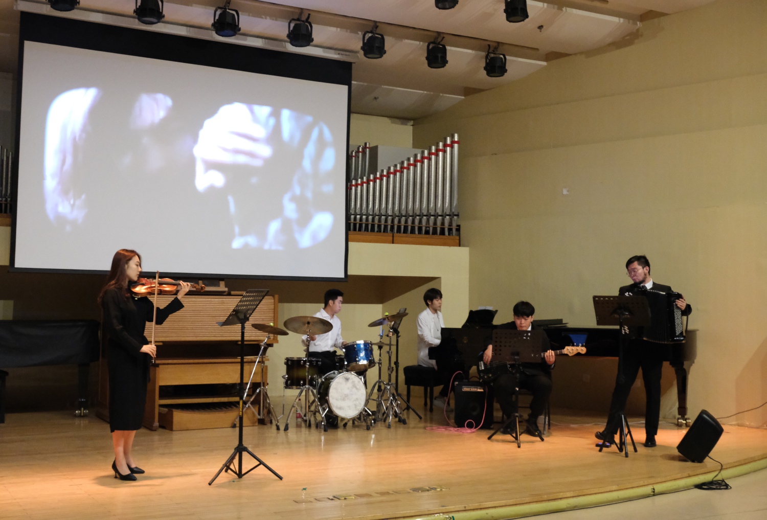 第三首为王酩曲、孟德政改编的《绒花》,小提琴(陆昕奕)主奏歌唱性的旋律,手风琴(韩译锐)、贝斯(韩毅)、钢琴(刘景毅)和鼓(张今)的组合为悠长的旋律增添了swing摇曳的节奏感,让现场的观众仿佛置身田野郊外吹拂清风。