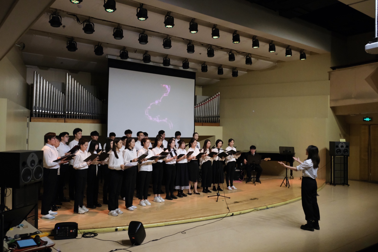 短暂的历史回顾视频播放后,音乐会正式开始。关闭音乐厅顶灯,抛却冗杂的布景,仅留下台下微微一点暖光,合唱团及乐手们登场了。