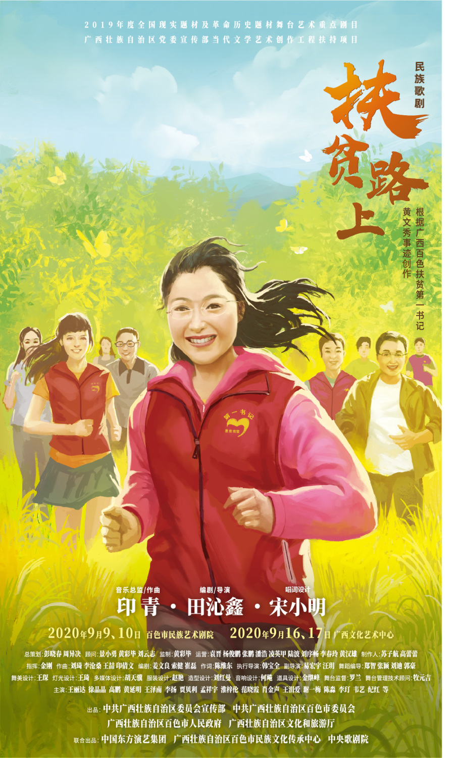 《扶贫路上》是由田沁鑫执导的民族歌舞剧。作品再现了牺牲在扶贫第一线的广西百色市乐业县百坭村第一书记黄文秀的感人事迹,并借此向280多万奋战在“扶贫路上”的驻村干部、青年党员和第一书记们,以及牺牲在扶贫岗位上的770余位一线干部致敬。该剧于2020年9月16、17日在南宁的广西文化艺术中心正式首演。