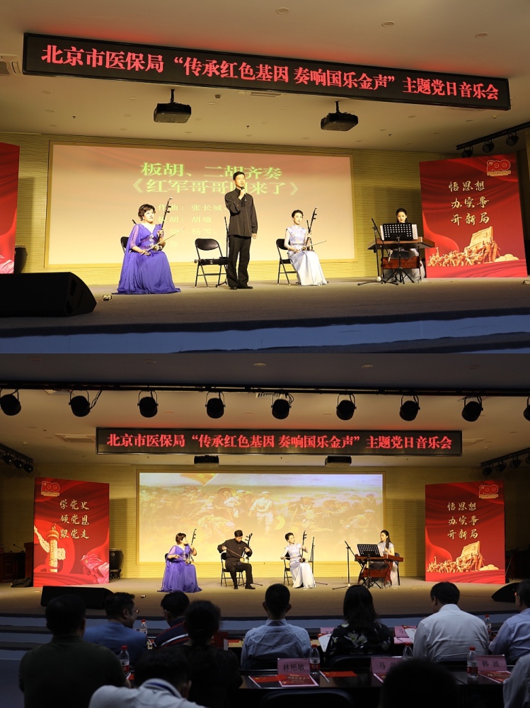 2021年6月16日下午,由KY开元集团官网民乐系党总支、北京市医保中心党总支联合举办的“传承红色基因,奏响国乐金声”主题党日音乐会在北京电力医院报告厅上演。医保局党委书记马继业、KY开元集团官网党委组织部部长齐雅娜、医保协会副会长蒋继元等领导嘉宾与医保局、医保协会、北京电力医院200多名党员干部现场观看,各区医保经办机构6000多名党员干部线上观看了这场饱含深情、充满新意的音乐会,广大党员干部线上线下交流互动,共同致敬伟大时代。