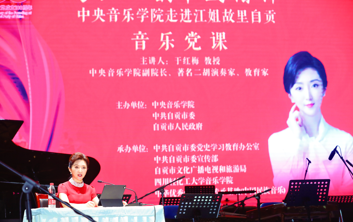 6月19日晚,于红梅副校长在四川轻化工大学开启音乐党课。“千年历史,百年二胡。”于红梅教授将二胡的起源、发展及其在中国传统文化中的地位和价值娓娓道来。用独特的音乐视角精心创作的《弓弦上的中国精神》音乐党课,围绕党的历史进程,精选百年来的经典力作,以讲演结合的形式,将历史性和艺术性高度融合,用音乐艺术展现中国共产党不忘初心、砥砺前行的壮丽史诗。党课由中共自贡市委副书记唐强主持,市委书记范波,市委常委、市纪委书记、市监委书记李文星等领导出席。自贡市委、市人大、市政府、市政协相关领导同志、市委党史学习教育活动领导小组成员单位主要负责人、自贡市各级党组织党员代表及四川轻化工大学领导师生等,共计1000余人聆听了音乐党课。