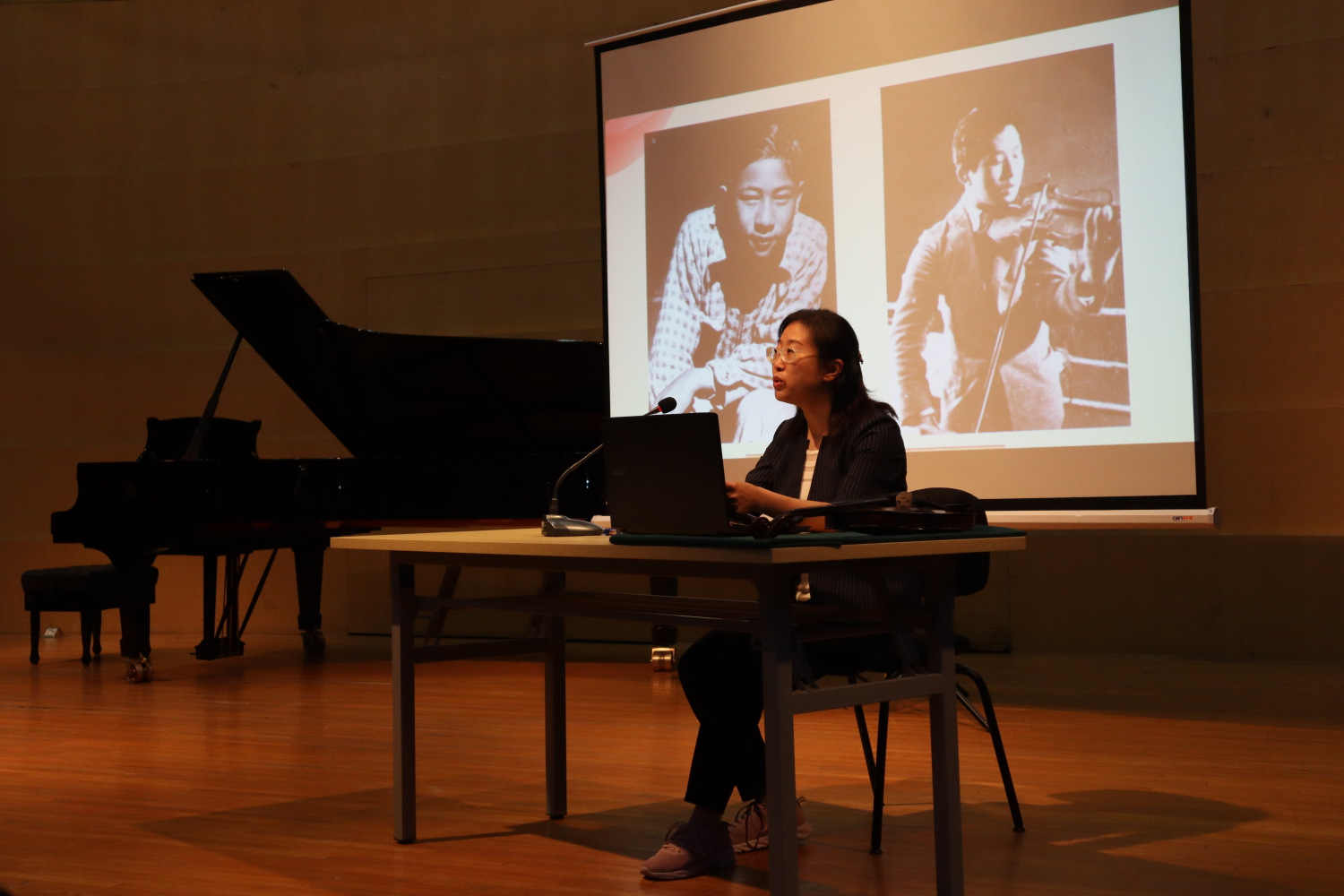 接下来,陈婷老师向大家简单介绍了聂耳的生平。聂耳是我国近代著名的作曲家,也是一位革命者,被誉为“无产阶级音乐奠基人”。聂耳在1931年来到上海之后,通过帮助朋友租借唱片获得的酬金买了这把二手小提琴,也正是这把琴,陪伴着聂耳创作出了那些振奋人心的作品。聂耳生活的那个时代,国家与民族所受的屈辱与伤痛时刻警醒着青年一辈,革命激荡着人们的心灵。1933年初的一个深夜,聂耳正式加入中国共产党,成为了一名青年党员。此后,他多次以音乐家的身份作为掩护,执行上级党组织交派给他的重要任务。他用音乐为青年们描摹了奋战的方向,为民族指明了一条重获新生的道路。