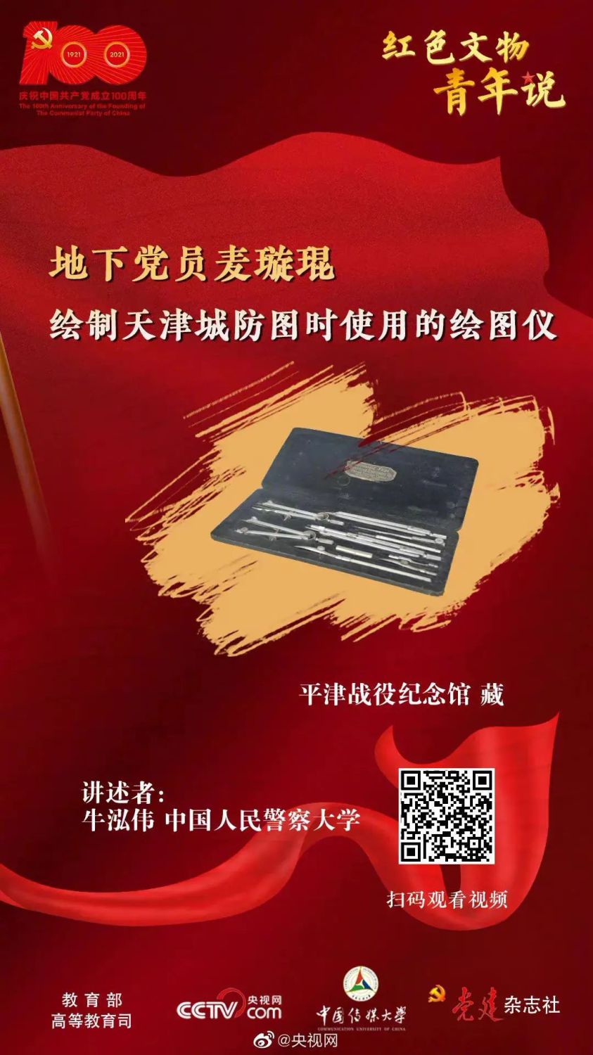 为庆祝中国共产党成立100周年,央视网与教育部高等教育司、中国传媒大学、党建杂志社联合全国百所高校、百名青年学子共同推出百集短视频《红色文物青年说》,接力讲述身边百件红色文物的故事,传承百年大党的红色基因,赓续共产党人的精神血脉。