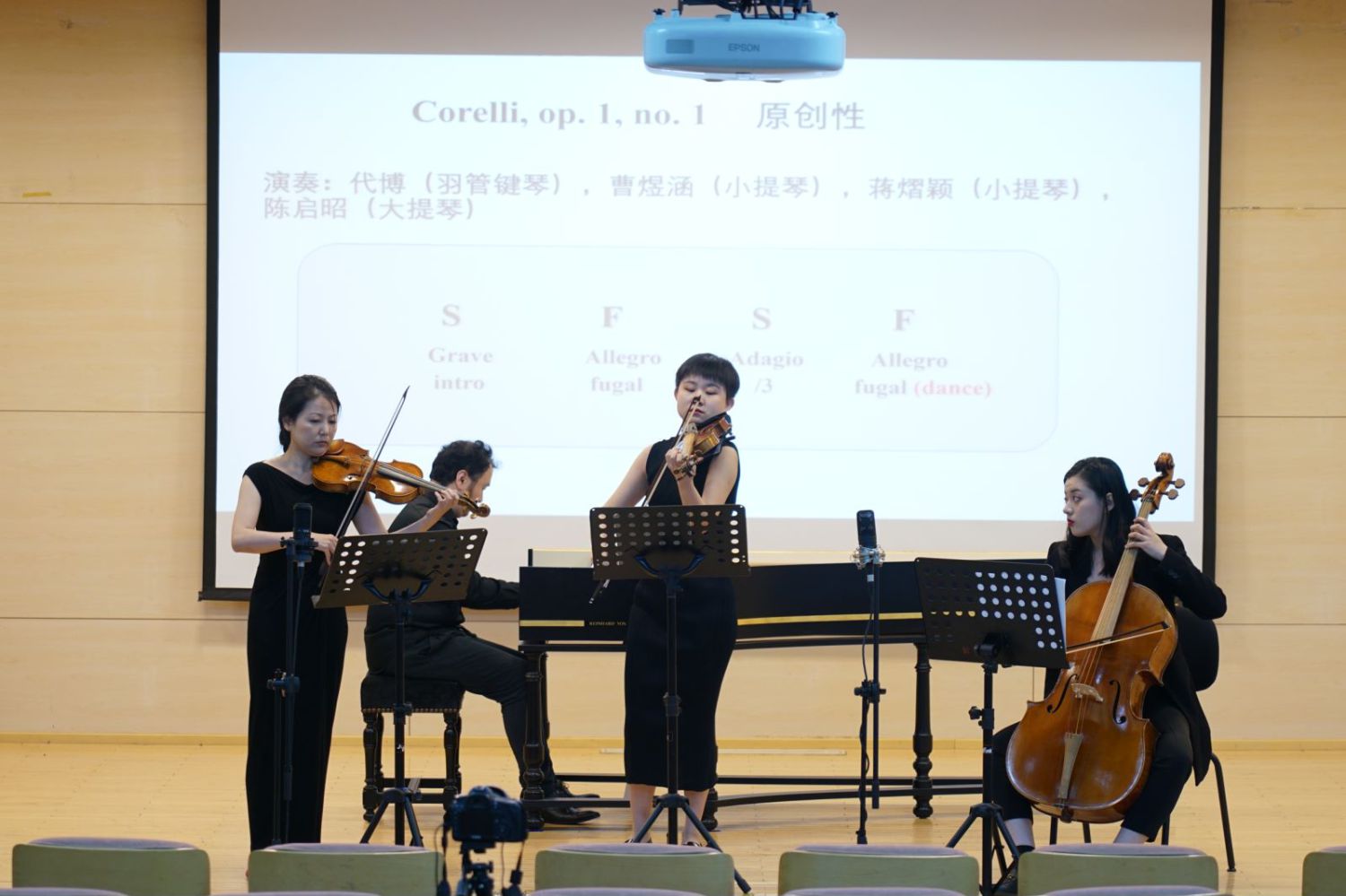 第一部分的曲目选择了科雷利的《奏鸣曲》(Op.1, No.1)(1681)和亨德尔的《奏鸣曲》(Op.2, No.6)(1733),由代博老师,曹煜涵老师、蒋熠颖和陈启昭进行演奏。
