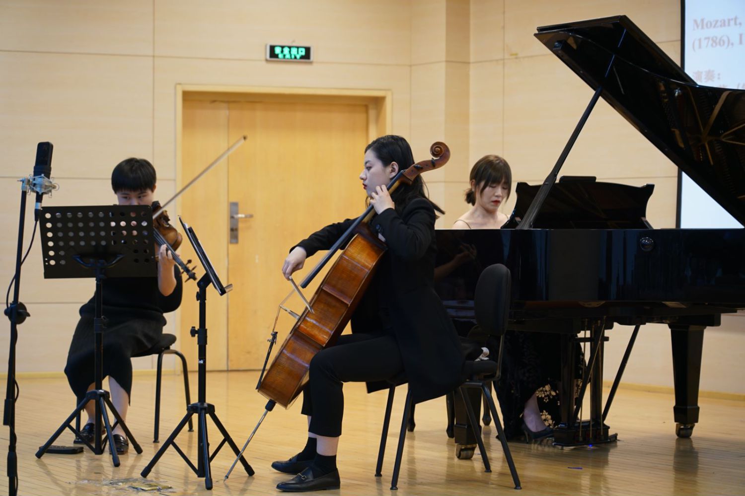 本场音乐会的第二部分,就到了“三重奏”完全由三件乐器组成、大家更为了解的古典时期。这一部分,贾抒冰老师以“钢琴”这一乐器的演变进化为线索,选择了三位大家都非常熟悉的音乐家——海顿、贝多芬、莫扎特,深入地对18世纪末期这种合奏音乐转型的“古典风格”创作理念进行了讲解。在曲目上则选择了莫扎特的《钢琴三重奏》(k.502)(1786),第一乐章,海顿的《钢琴三重奏》(Hob 15:6)(1784),第二乐章,和贝多芬的《钢琴三重奏》(Op.1, No.1)(1785),第三乐章。由谢子薇老师,蒋熠颖和陈启昭进行演奏。