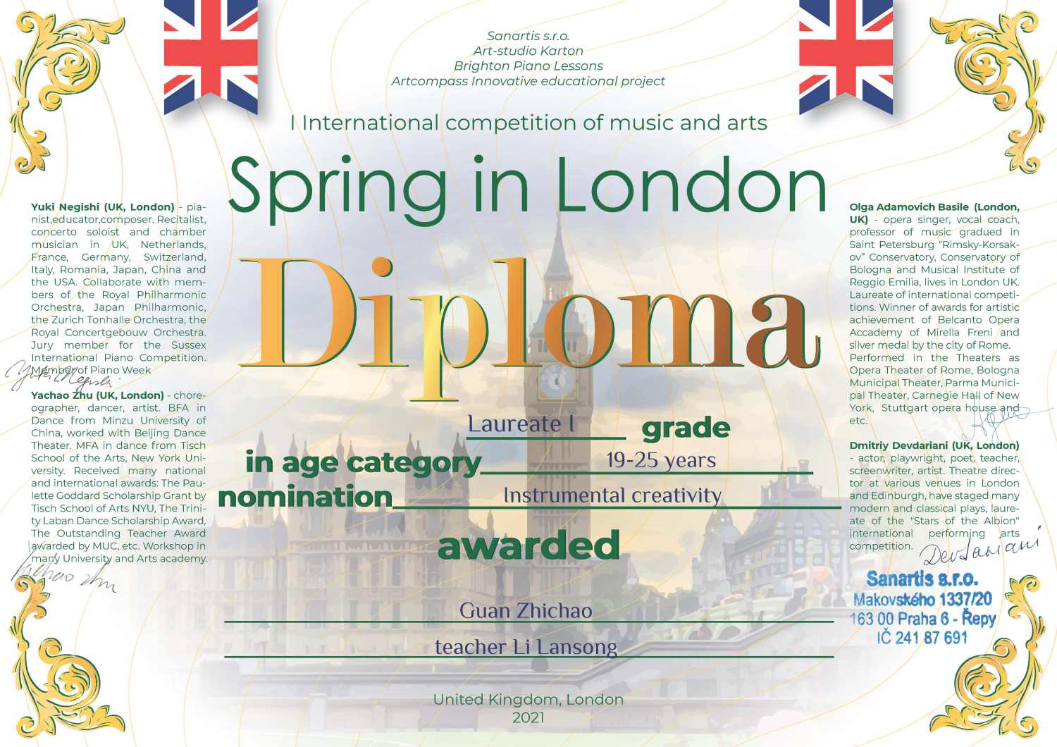 2021年获得伦敦之春国际音乐和艺术比赛一等奖。