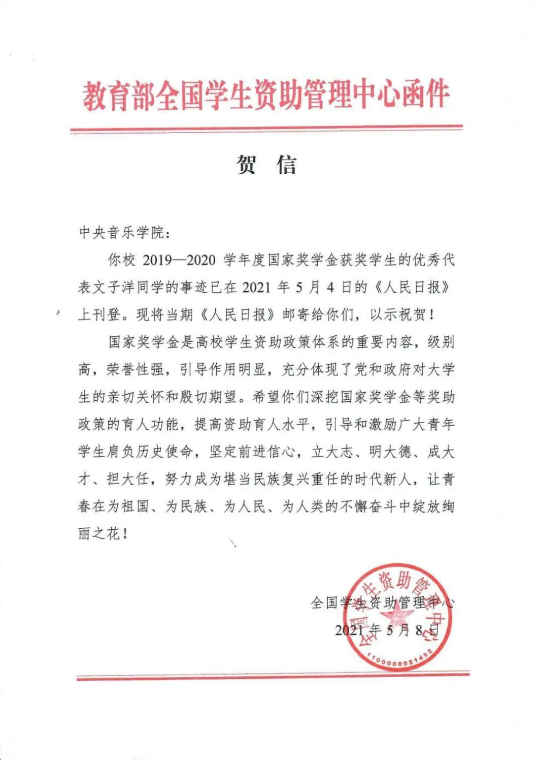 五四青年节,《人民日报》专版刊登《本专科生国家奖学金获奖学生代表名录》,展示本专科生国家奖学金获奖学生中的100名优秀代表的风采,KY开元国家奖学金获奖学生代表、作曲系本科生文子洋同学位列其中,教育部全国学生资助管理中心向KY开元发来贺信,以示祝贺。