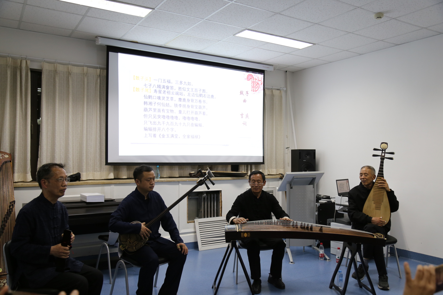 南阳大调曲子是国家第二批公布的非物质文化遗产项目。演奏乐队由三弦、古筝、琵琶组成,另有拍板配合节奏伴随人声演唱。演奏家需要对所有乐器演奏熟练精通并可以调换表演乐器的位置,这需要长期的学习和表演默契配合。演出过程中,司荣亭老师向观看演出的师生们系统讲解了南阳大调曲子流变、源头归宿及曲牌的使用情况。司老师在长期的演奏实践和研究过程中共收集了300多种不同的南阳大调曲子曲牌。演出最后以欢乐吉祥的《吉庆词》结束,寓意祝愿全校师生欢乐吉祥、学有所成。