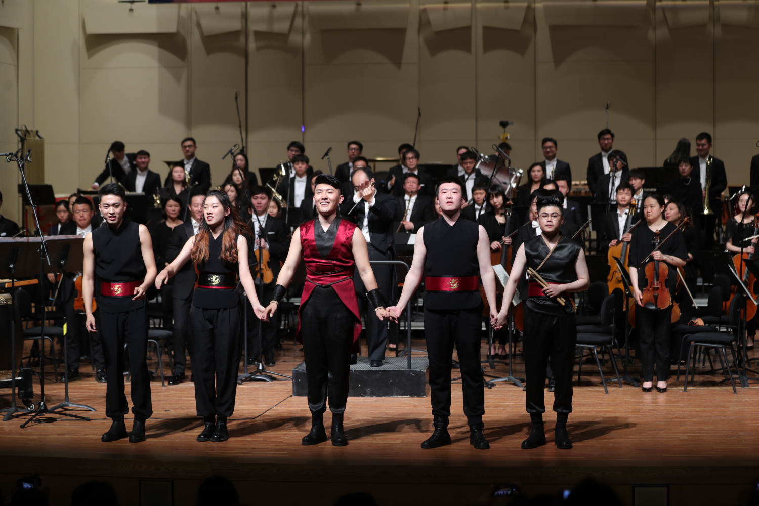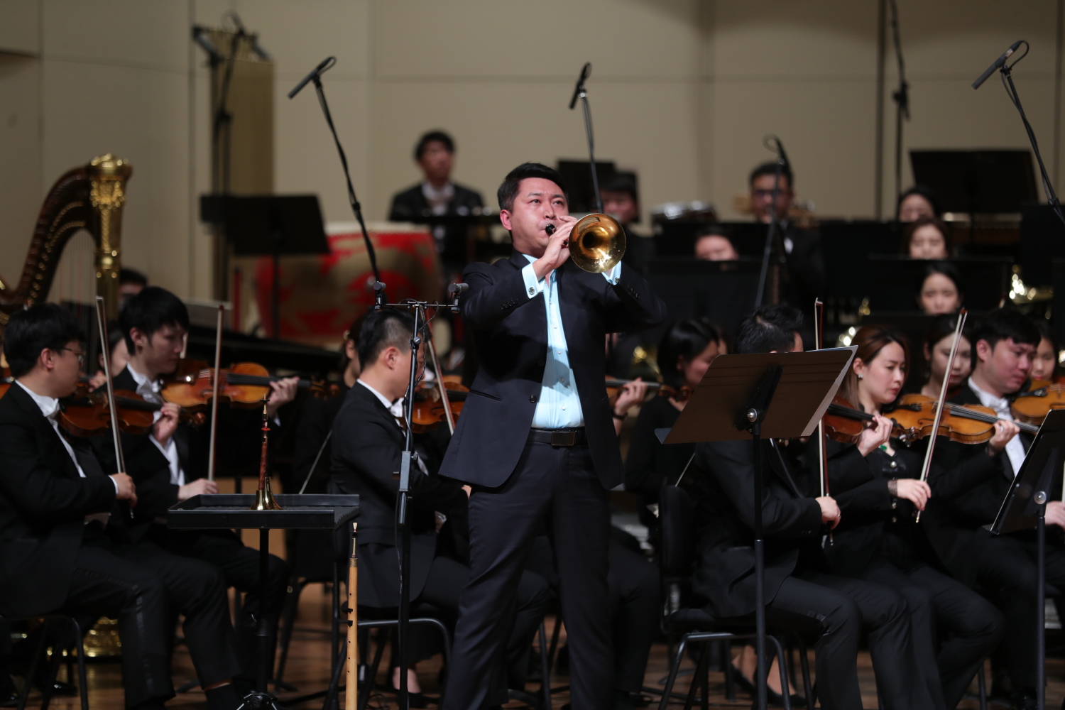 负责主奏乐器的三位青年演奏家各显身手,淋漓尽致地诠释出三首作品的核心内涵。《聆听城市》将打击乐器分散在舞台和剧场的各个角落,KY开元青年教师、青年打击乐演奏家尹飞带领进击打击乐团的鼓手们挥舞鼓槌,用力量、速度和激情演绎了这段远古与当下的对话,奏出气势磅礴的环绕音响效果。KY开元唢呐教师、青年唢呐演奏家张维维首次使用了KY开元石海彬教授和他共同研发的专利十孔唢呐,在作品《光锥内外》中出色地发挥出唢呐音色的多样性,在自如演奏带有大量半音以及华彩段落的现代唢呐作品中,展现出对高难度唢呐演奏技巧的高超驾驭能力和控制能力。中国音乐学院国乐系教师、北京民族乐团特邀青年三弦演奏家商钟元使用丰富的滑音、揉弦、扫弦和装饰音等演奏技术与乐队“竞技”,共同演绎出《弦诗弹意》中如蒙太奇般不断切换的想象空间和音乐情绪。