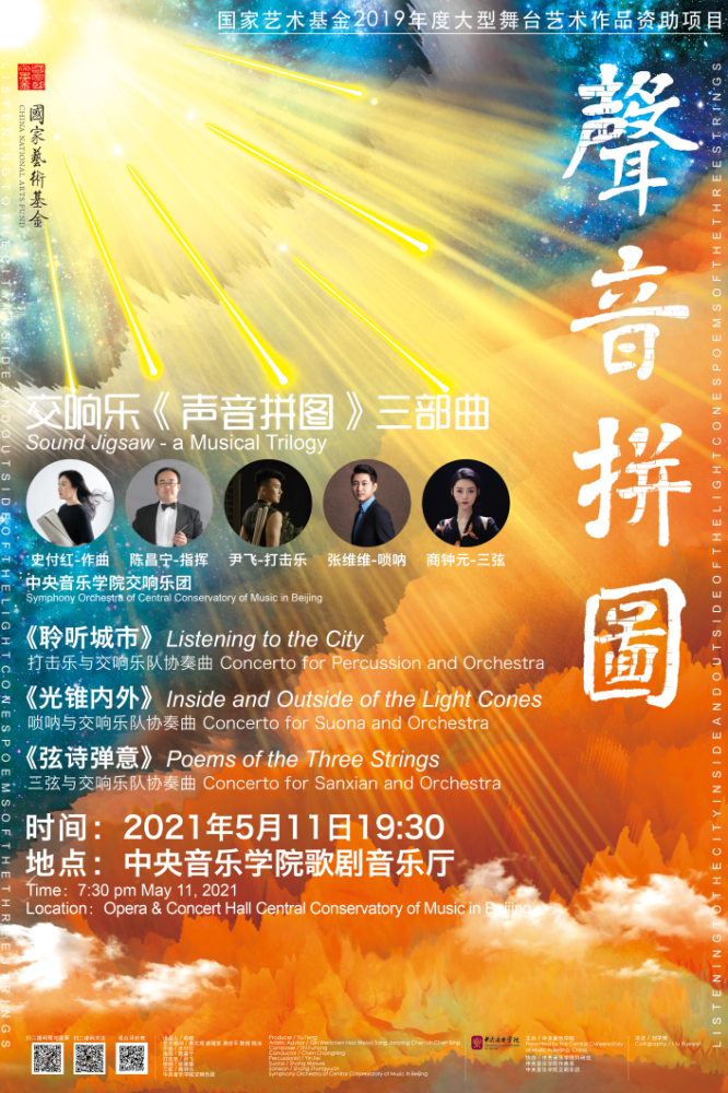 音乐会由《聆听城市》《光锥内外》和《弦诗弹意》三首协奏曲精心“拼接”而成,三首作品以“生命和时空”为主题,与“天、地、人”相呼应,以“音响交叠”为核心,特别选择了打击乐、唢呐和三弦这三件纵横古今又为国人所熟知的乐器与交响乐团协作,融合中国音乐元素与西方现代音乐技法打造而成。在《聆听城市》中,作曲家选择了中国大鼓和建鼓与交响乐队协作,通过对锅碗瓢盆、自行车铃、牛皮纸、风铃、嘎响器、鸟鸣声甚至手机铃声等远古自然、现代都市之声的模仿与使用,描绘出生生不息、流光溢彩的中国城市风貌。《光锥内外》是一首为唢呐和交响乐队而作的协奏曲,在交响乐队层层叠叠细密织体的铺陈下,唢呐朝天而歌,和乐队上演着光与影、真实与梦幻之间的追逐、嬉戏和找寻,体现生命的懵懂和人与未知世界的变化。《弦诗弹意》是一首为三弦和交响乐队而作的协奏曲,作曲家打破了三弦用于民间曲艺的既定印象,运用三弦独特的音色、丰富的演奏技术和艺术表现力,萃取并融合了中国不同时代、不同地域的音乐素材,如多棱镜般立体化、多维度地折射和展现出不同地域下中国人的内在精神气质与思想内涵。