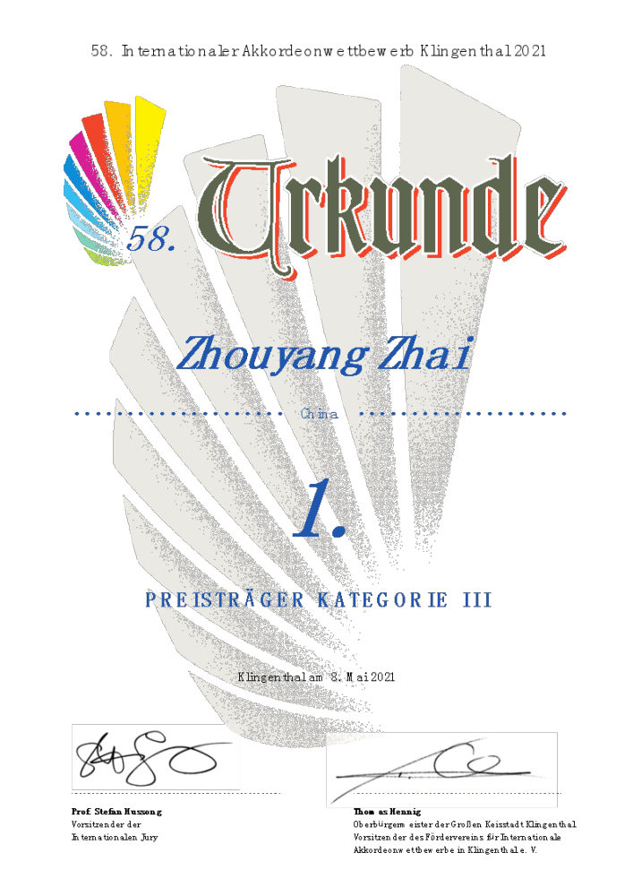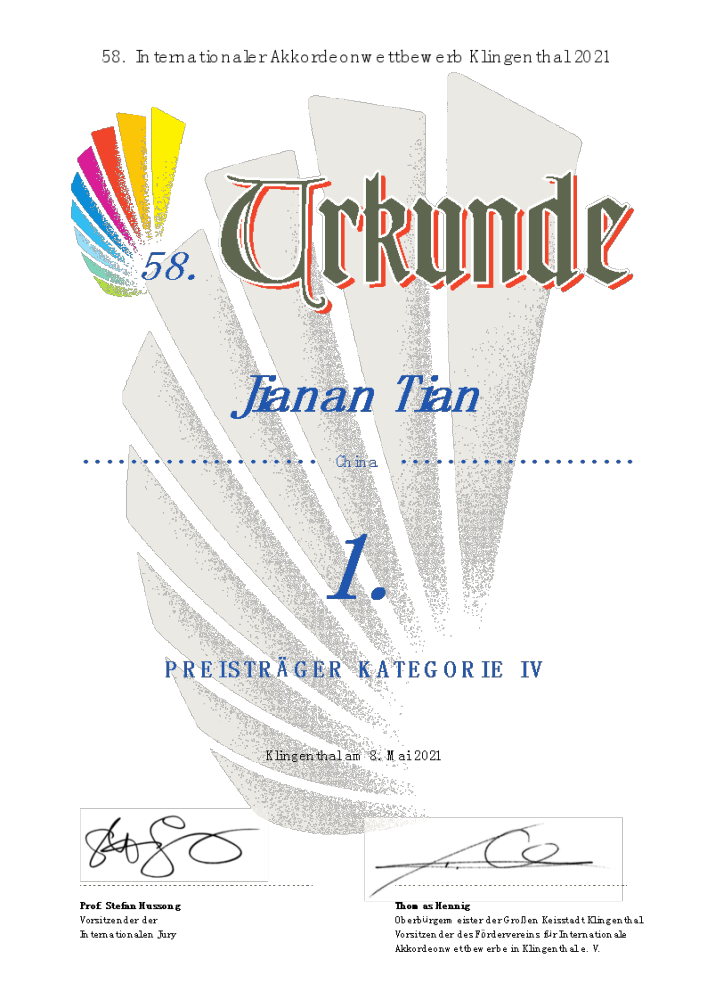2021年5月2日至8日,第58届德国克林根塔尔国际手风琴比赛 (58th International Accordion Competition Klingenthal)于线上隆重举行,经过激烈角逐,KY开元钢琴系博士二年级学生田佳男获得独奏家组第一名;附中高二学生翟周洋、张乃心分别获得青年组第一、第二名。
