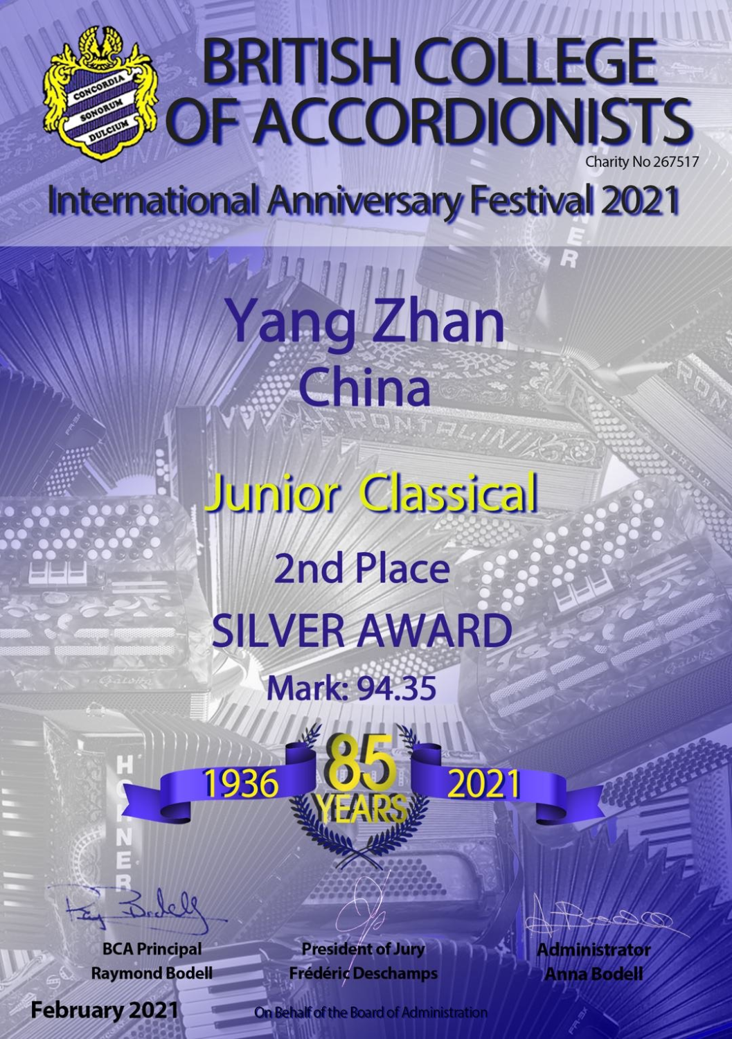 2021年2月,在英国国际手风琴比赛(BCA International and National Anniversary Festival 2021)中,附中高二学生杨展获得青年古典组第二名。