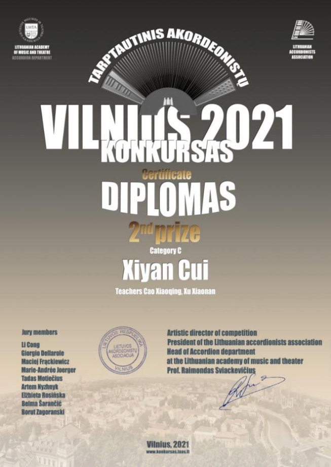2021年4月,在立陶宛维尔纽斯国际手风琴比赛(Vilnius 2021 International Accordion Competition)中,附中初二年级孙家桐和崔希言分别获得少年组第一名、第二名。
