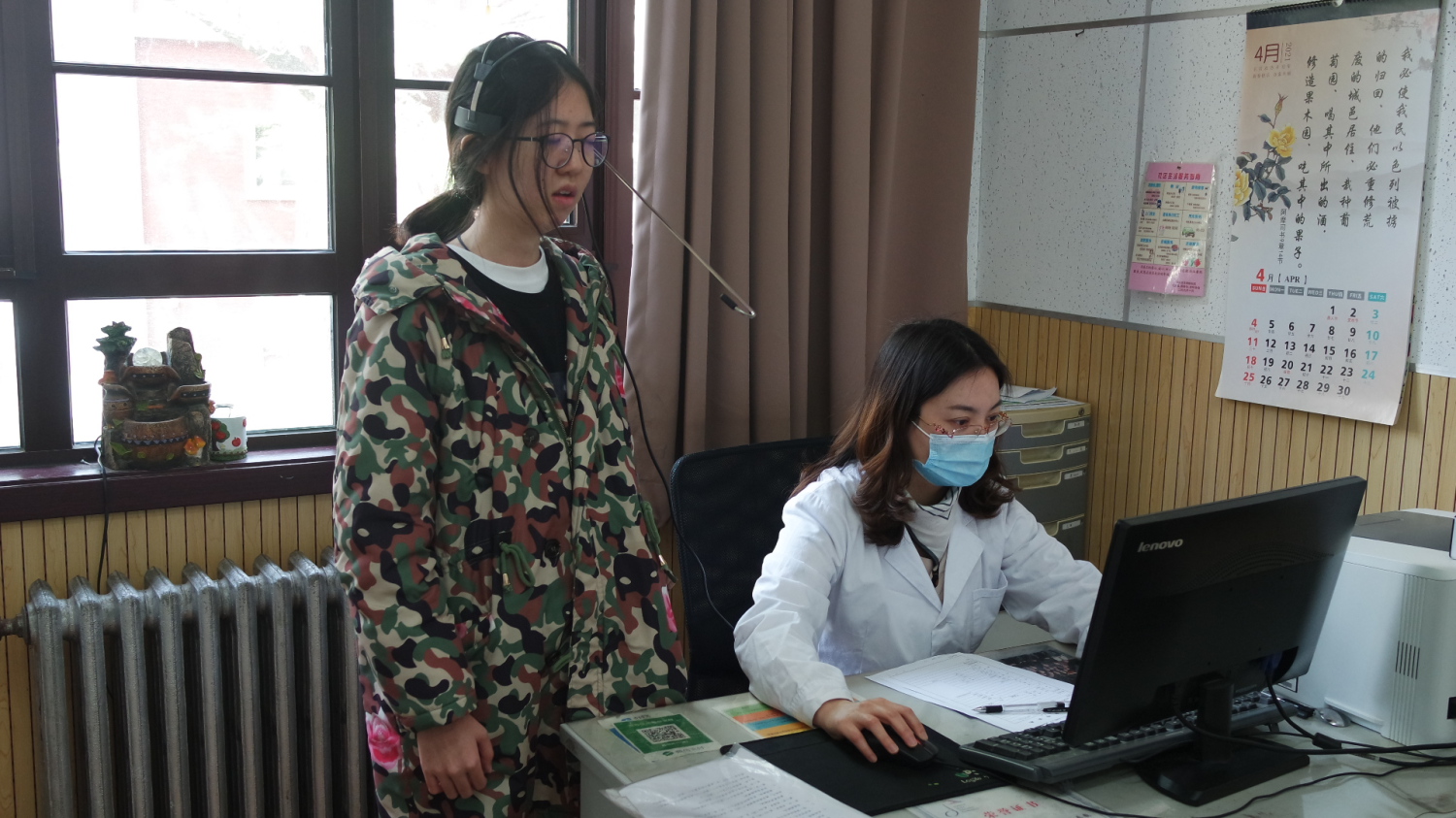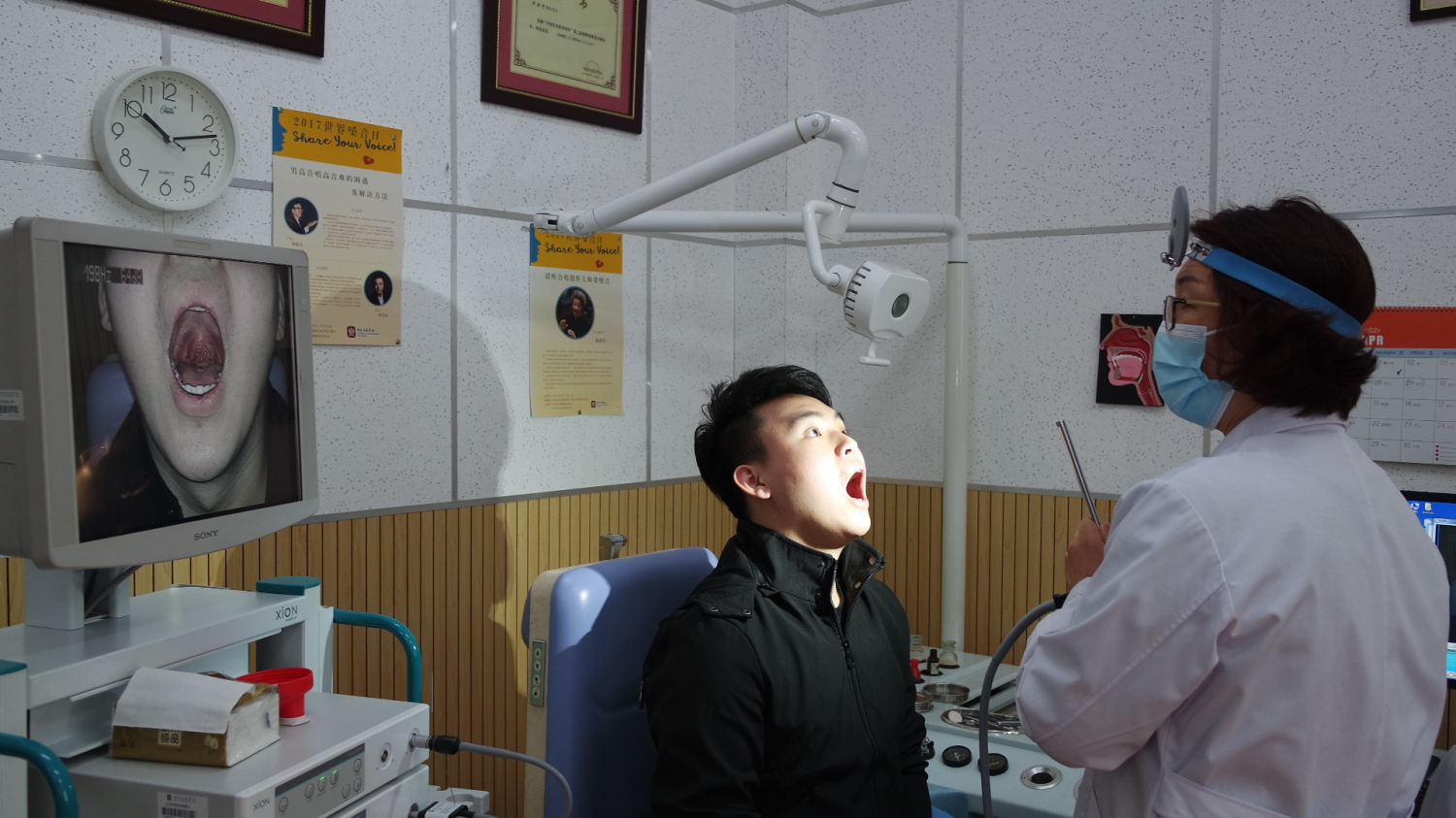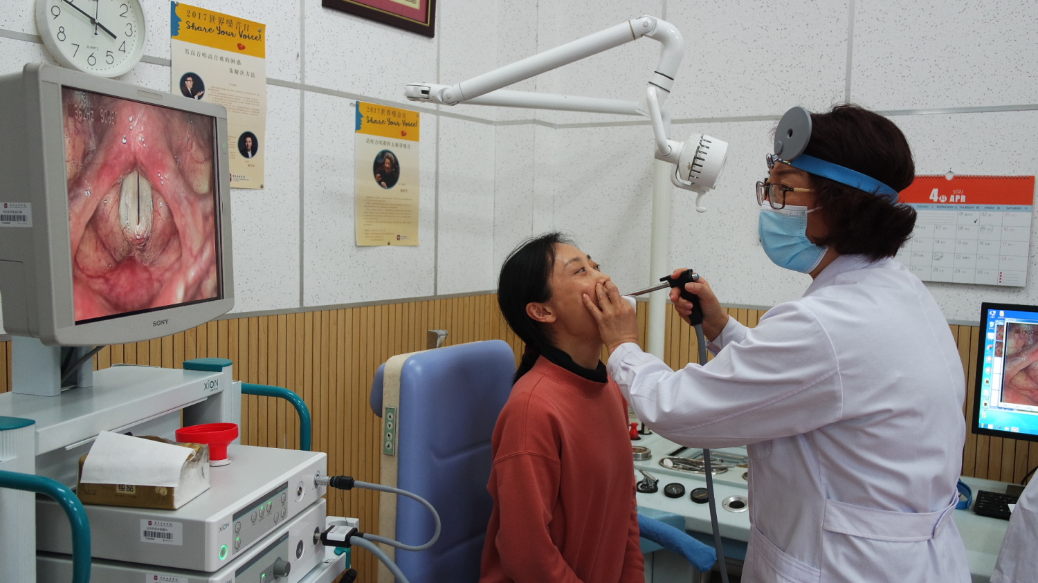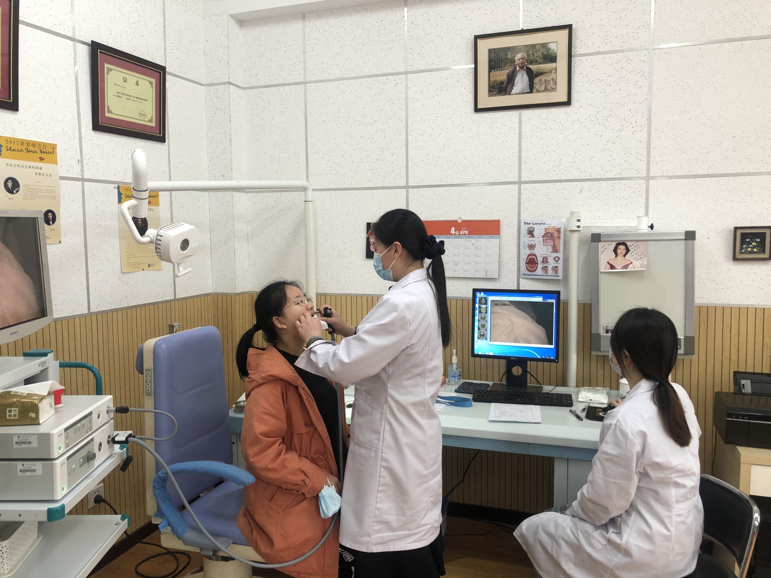 4月16日世界嗓音日当天,嗓音研究中心师生(包括毕业的和在校研究生)共7人参加了面向校内教职员工、学生的声带检测、音域图测试、嗓音问题咨询、发声训练指导等一系列义诊活动,共有近20位师生接受了义诊,包括声乐歌剧系学生、合唱团演员、音乐治疗师生、音乐学系师生等。有接受义诊的老师发出感慨说:“要是早知道自己的条件和问题所在,早一点关注、改进就好了。”