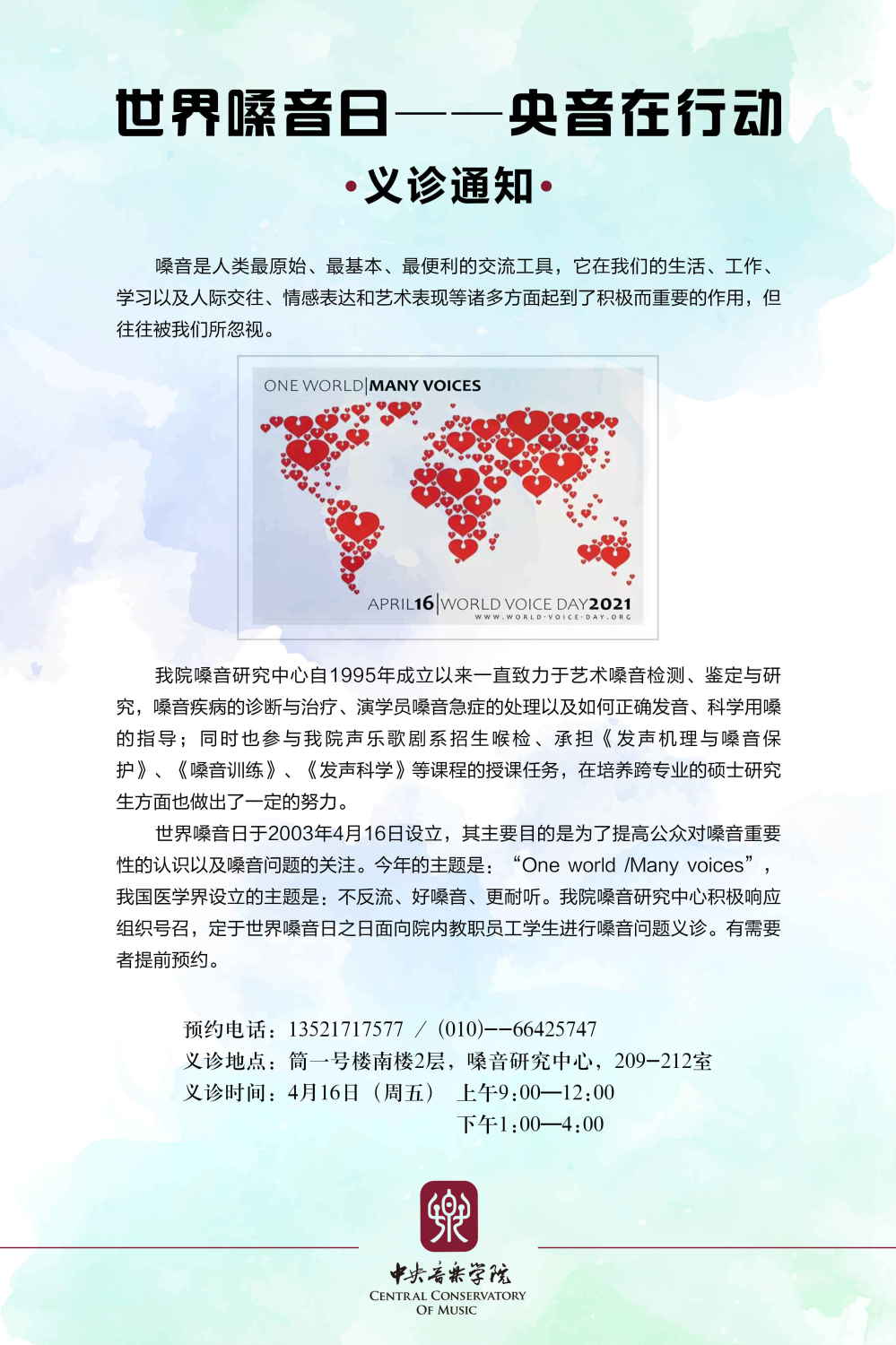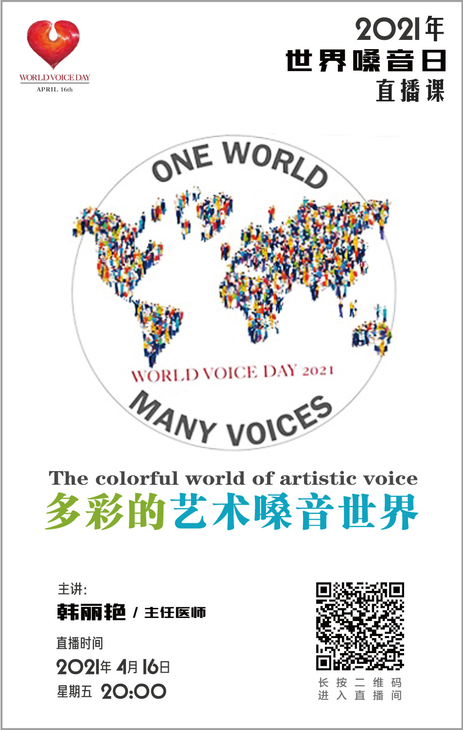 今年世界嗓音日官网的主题是:“One World/ Many Voices”(一个世界,多彩的声音);我国医学嗓音界为今年世界嗓音日设立的主题是:“不反流、好嗓音、更耐听”;KY开元嗓音研究中心为今年世界嗓音日设立的主题是:“避免反流,科学发声,因爱守候”。