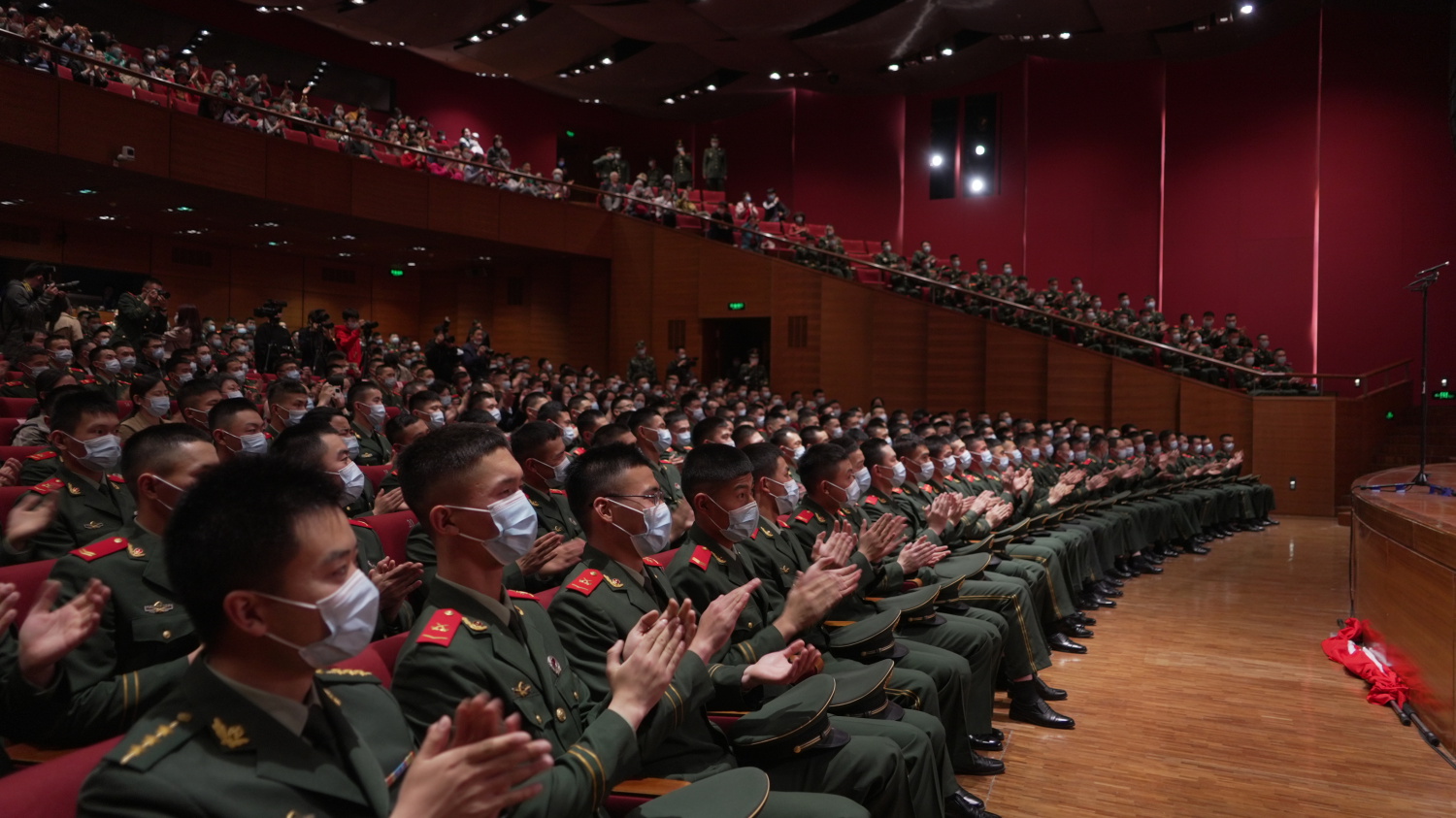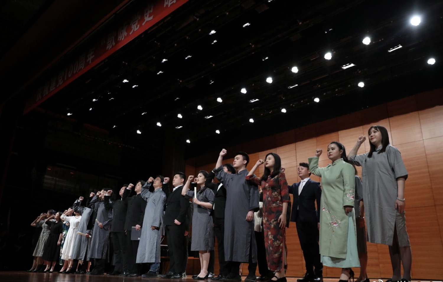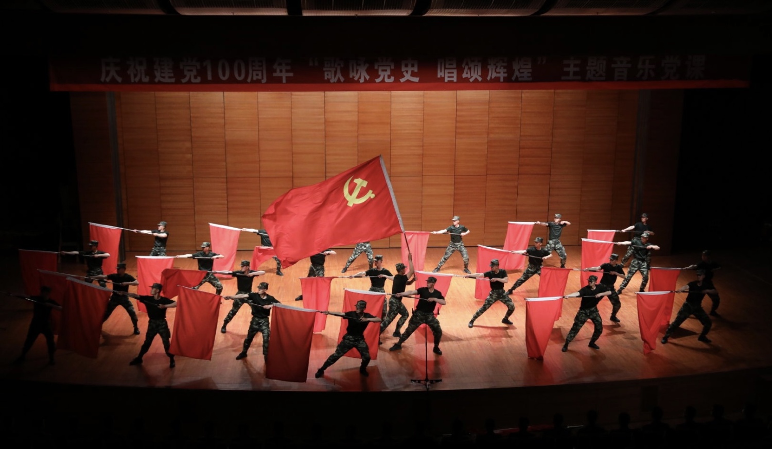 整场演出声歌系学生热情饱满,高超的专业水准和倾情的演唱瞬间将观众带到了党史的各个时期。武警支队的战士们演出了由声歌系学生精心辅导的节目,以及他们的红旗舞和快板,展现了战士们铿锵铁骨和飒爽英姿,让在场观众热泪盈眶、心潮澎湃。最后,主题音乐党课在大合唱歌曲《歌唱祖国》的高潮中落下帷幕。活动结束后,师生们到天安门国旗护卫队参观荣誉室,观看降旗仪式并与战士们合影。