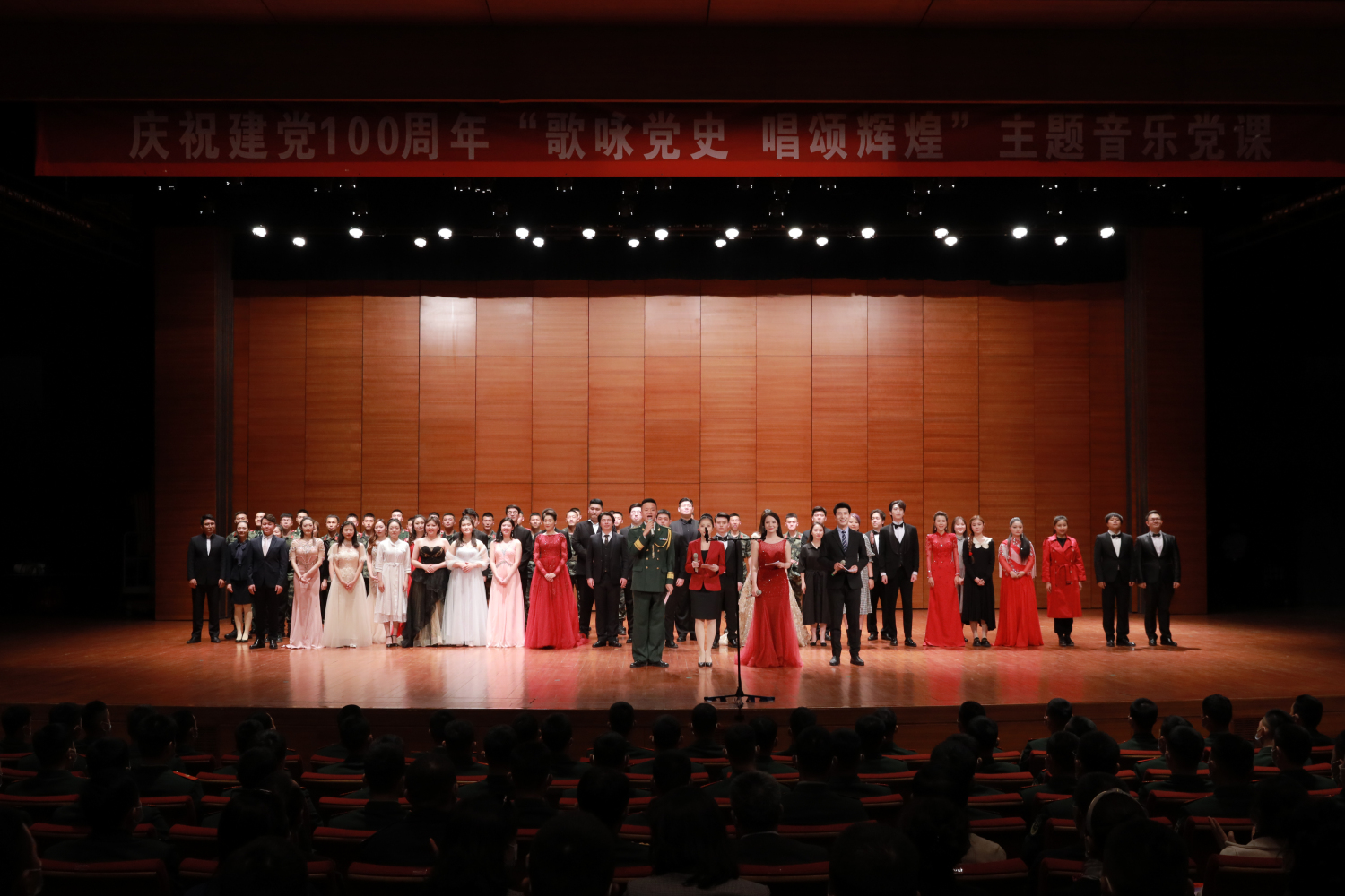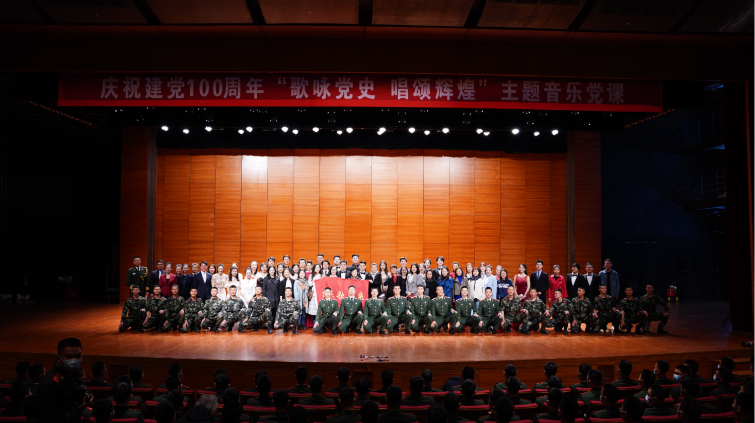 为迎接中国共产党百年华诞,2021年4月18日,KY开元集团官网声歌系、国家博物馆和武警北京总队执勤一支队在国家博物馆礼堂举办了一场别开生面的“歌咏党史 唱颂辉煌”主题音乐党课,用“文物+音乐”的党课新模式,讴歌党的奋斗历程,使青年学生与战士们共同在艺术氛围中接受精神的洗礼、感受信仰的力量。KY开元声歌系共有近40名学生参演。校声歌系党总支书记陈冰、武警天安门支队领导和中国国家博物馆领导及KY开元多位党员教师和支队官兵们观看了演出。