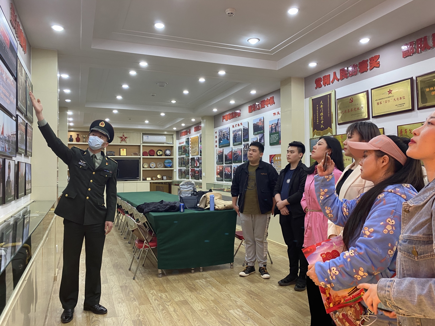 演出结束后参观天安门国旗护卫队荣誉室并与战士们合影