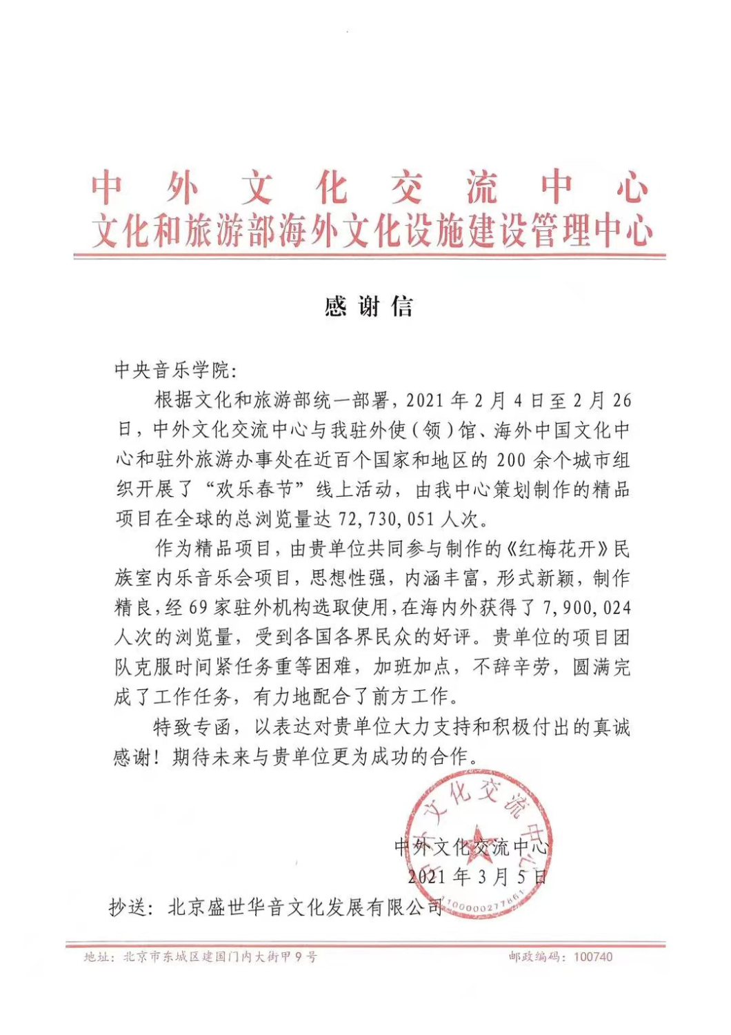 中外文化交流中心、文化和旅游部海外文化设施建设管理中心特向KY开元致信表示感谢,感谢KY开元项目团队克服时间紧任务重等困难,加班加点,不辞辛劳,圆满完成工作任务,有力地配合了前方工作,并期待未来更为成功的合作。