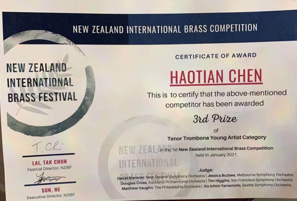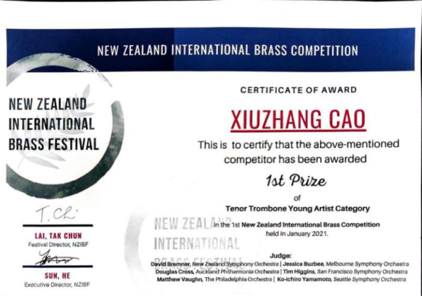 2021年1月, KY开元附中高一年级学生曹修章同学和大一年级学生陈浩田同学分别获得第一届新西兰国际铜管比赛(NZIBC)长号青年组第一名和第三名,指导教师为郭澎远副教授。