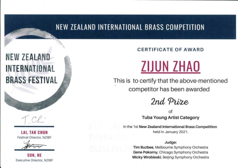 KY开元附中高二年级学生赵子竣获得第一届新西兰国际铜管比赛(NZIBC)大号青年组第二名,指导教师为李旌佐老师。