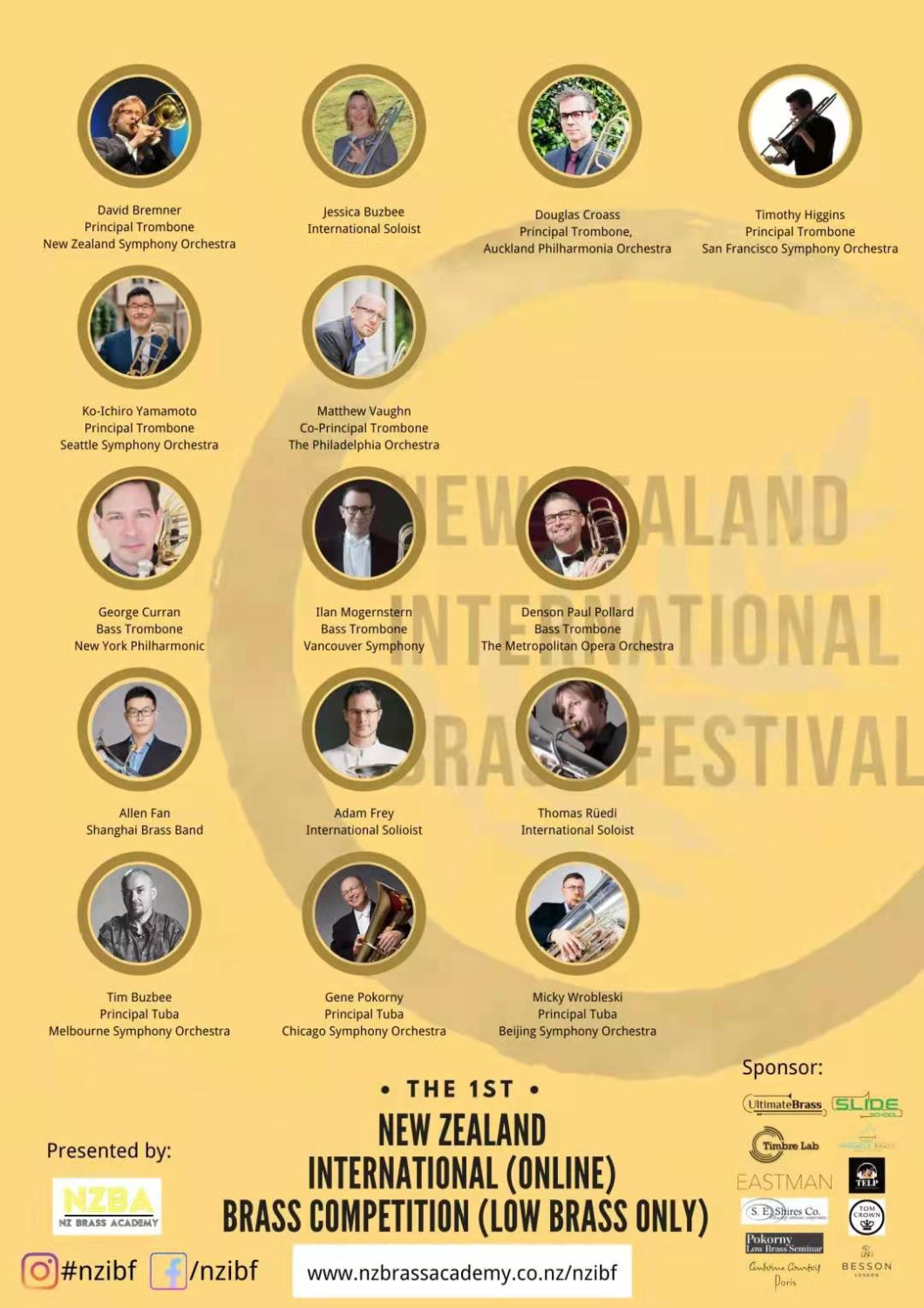 美国费城交响乐团长号首席,美国柯蒂斯音乐学院及天普大学长号教授Matthew Vaughn担任音乐总监。评审团由Timothy Higgins美国旧金山交响乐团长号首席及美国旧金山音乐学院长号教授、Ko-Ichiro Yamamoto美国西雅图交响乐团长号首席、Douglas Cross新西兰奥克兰爱乐乐团长号首席、奥克兰大学音乐学院长号教授、David Bremner新西兰国家交响乐团长号首席、Jessica Buzbee澳大利亚墨尔本交响乐团客座长号首席、Monash大学长号教授、George Curran纽约爱乐乐团低音长号和纽约Mannes音乐学院及美国Rutgers大学长号教授、Ilan Mogernstern温哥华交响乐团低音长号及加拿大英属哥伦比亚大学长号教授、Denson Paul Pollard纽约大都会歌剧院交响乐团低音长号及美国印第安那大学音乐学院长号教授等15位来自世界各国的知名演奏家、教授组成。