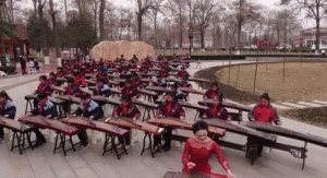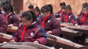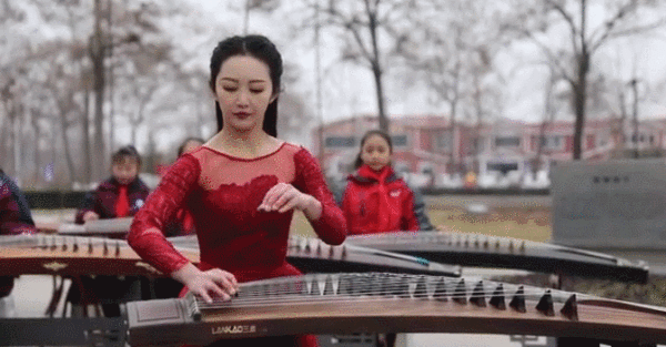 2月15日,一袭红衣的李杨冠宇,双手轻弹古筝,一曲《一起向未来》的美妙旋律在琴弦上流淌。在她的身旁,是80多名轻抚古筝的学生,以及远近闻名的“焦桐”。