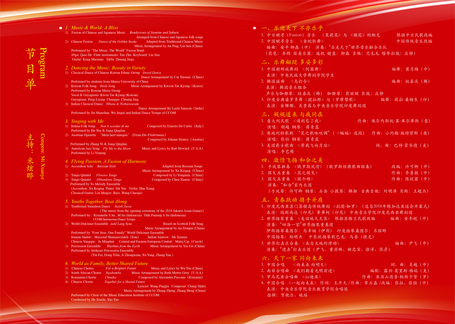 本场音乐会在KY开元音乐学系世界民族音乐专业博士生、主持人米炫晔“新年好”的祝福声中拉开帷幕。她首先说道:“本场世界音乐会的主题‘乐迎天下,一起向未来’既是‘有朋自远方来,不亦乐乎’的热忱表达;也是‘以乐会友’浪漫的知音分享;更是欢聚一堂、携手并肩、同向未来的追求与向往。”接下来,音乐会在主持人的引导下分为六个篇章有序展开,层层递进。